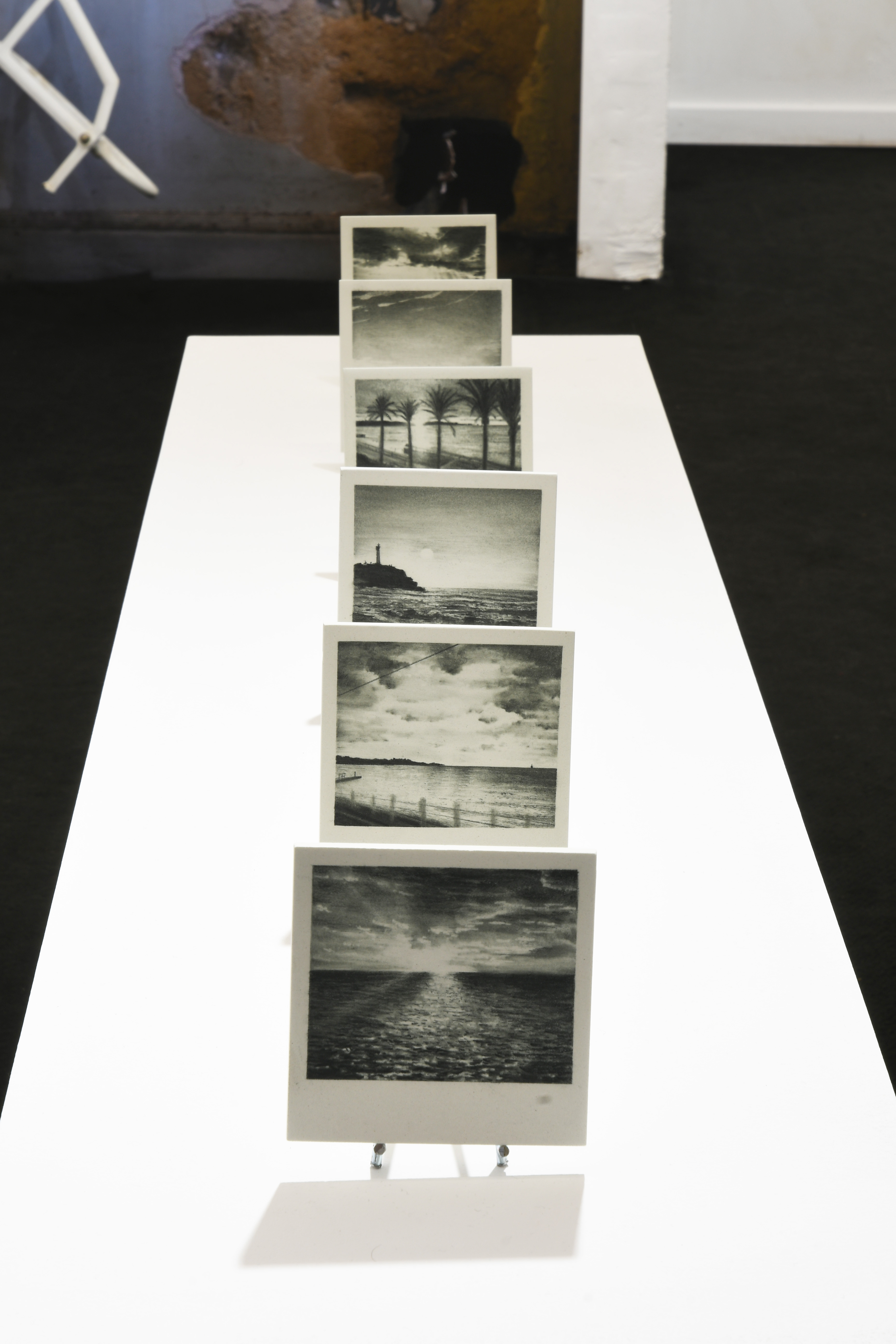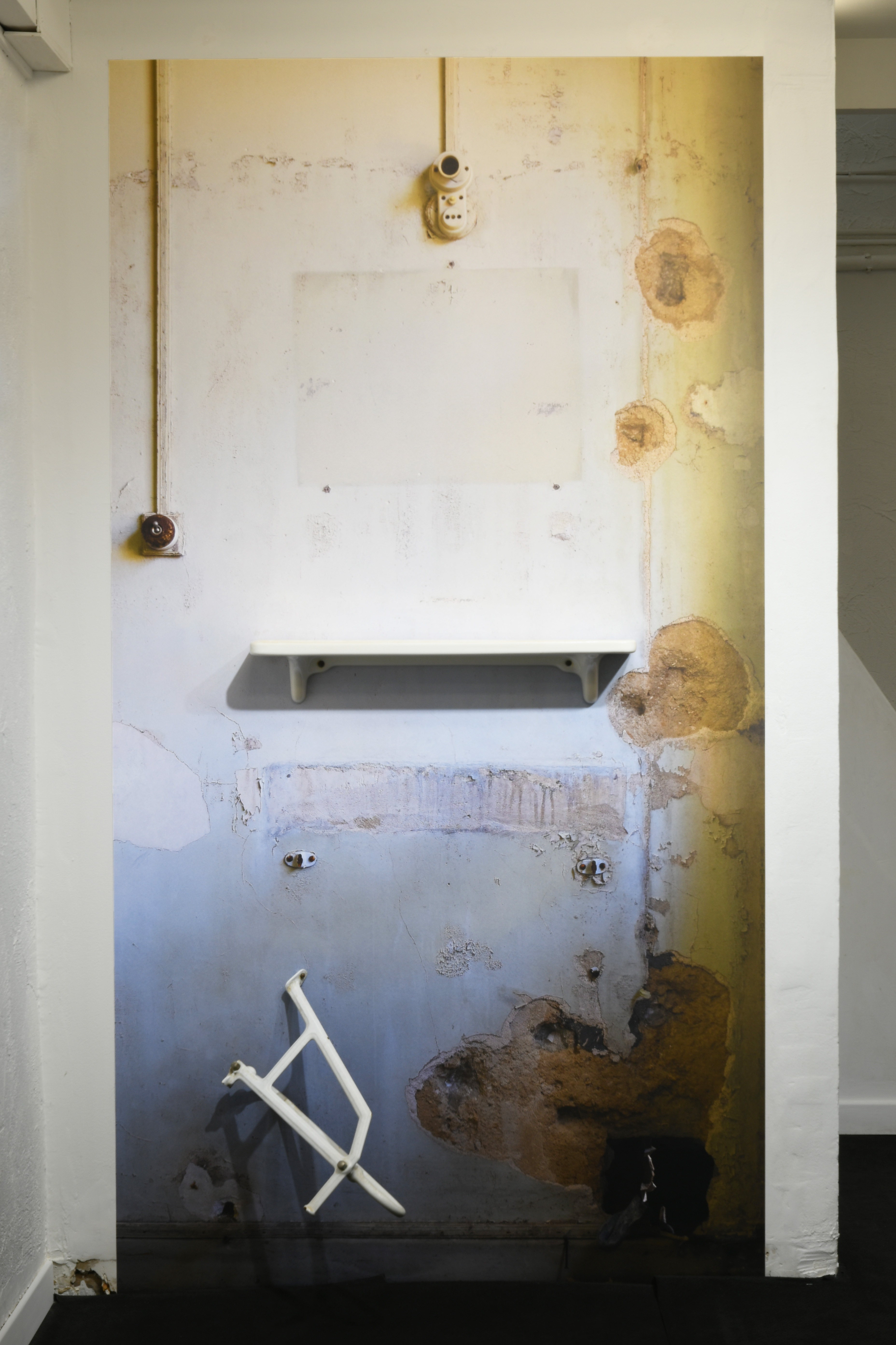Face à l’entrée de la galerie, la photographie à l’échelle réelle d’un mur portant la trace d’un lavabo (accompagné de son support tordu encore présent) est particulière émouvante, d’autant qu’on apprend qu’elle est issue d’un sanatorium.