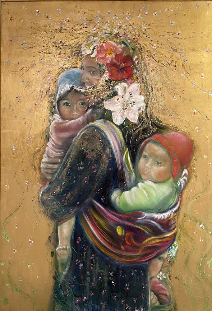 À ces femmes, mères, reines, anges ou petites filles, Daniela apporte une touche de modernité dans l’expression d’une sensualité douce et de couleurs intenses. Mères en majesté, ou mères couvertes de châles avec leurs enfants dans les bras, entourées de fleurs, de fruits et d’oiseaux, ou simplement assise sur un hamac. Dans sa série des « Maternités » la mère est magnifiée, elle exprime l’universel et la complicité avec son enfant à travers les regards qui s’échangent. Si la mère est attentive, l’enfant est paisible, il se sait en sécurité dans ses bras.