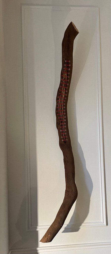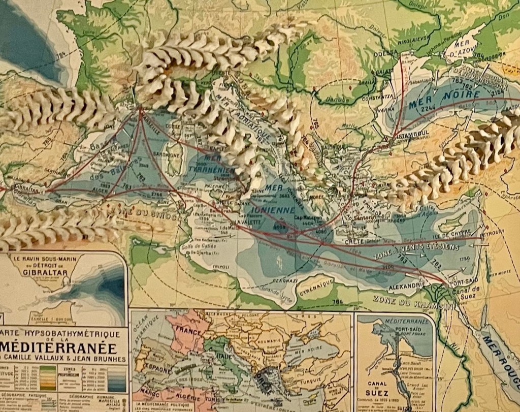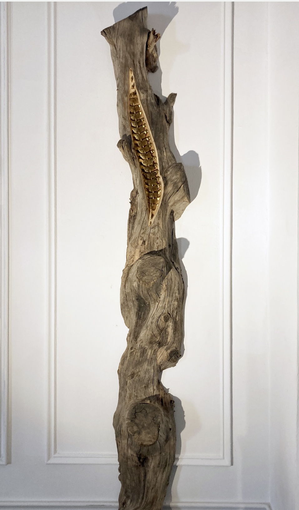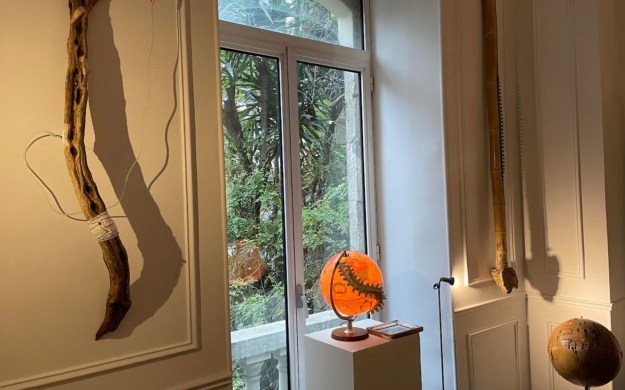 Cette exposition à l’Hôtel Windsor arrive à un moment particulier de la démarche de l’artiste où le monde végétal surgit dans son travail. Il nous invite à découvrir des mini-colonnes vertébrales au cœur de branches d’arbres, de bambous soigneusement choisis ou sur ces merveilleuses cartes géographiques (qui nous faisaient rêver sur nos bancs d’écoles) dont il en habille les reliefs montagneux.