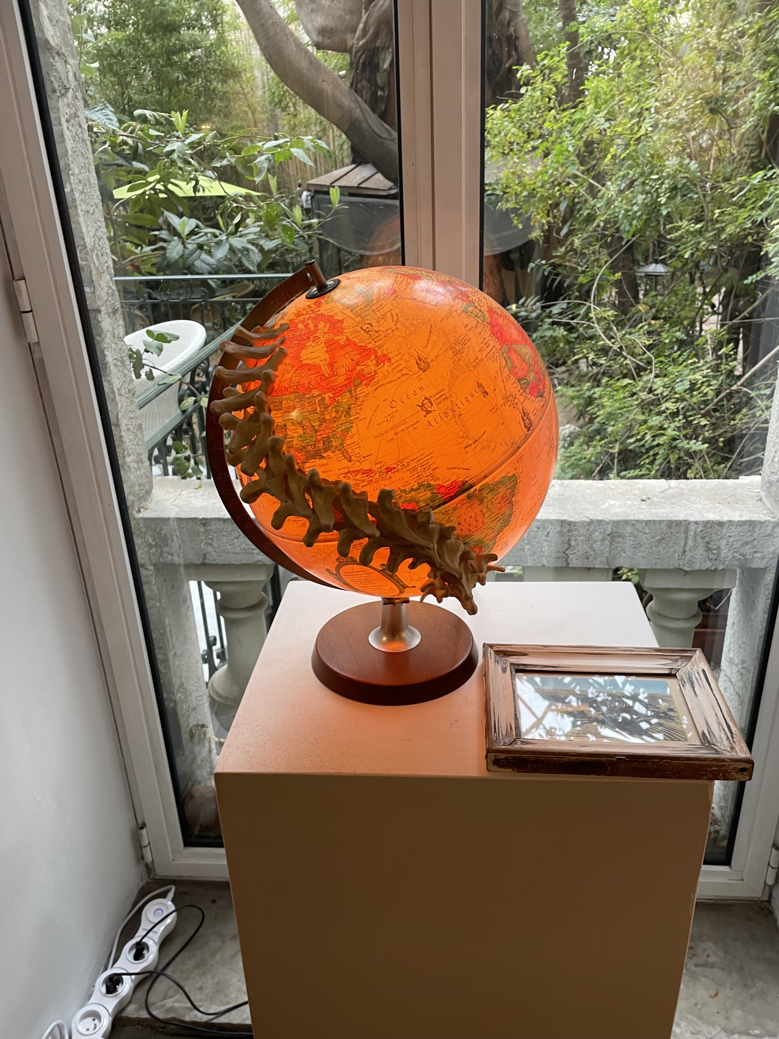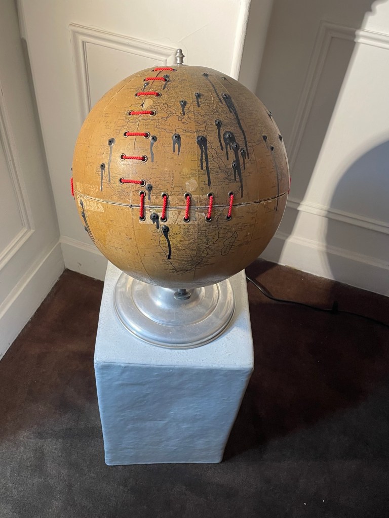 À découvrir également un globe terrestre recousu et taché de noir à l’image de notre monde souillé et à réparer. Est présentée également une installation grandiose sur un trône ouvragé, d’une souche d’arbre torturée portant les orbites d’un crâne humain démesuré d’une planisphère bleue remplaçant l’os occipital.