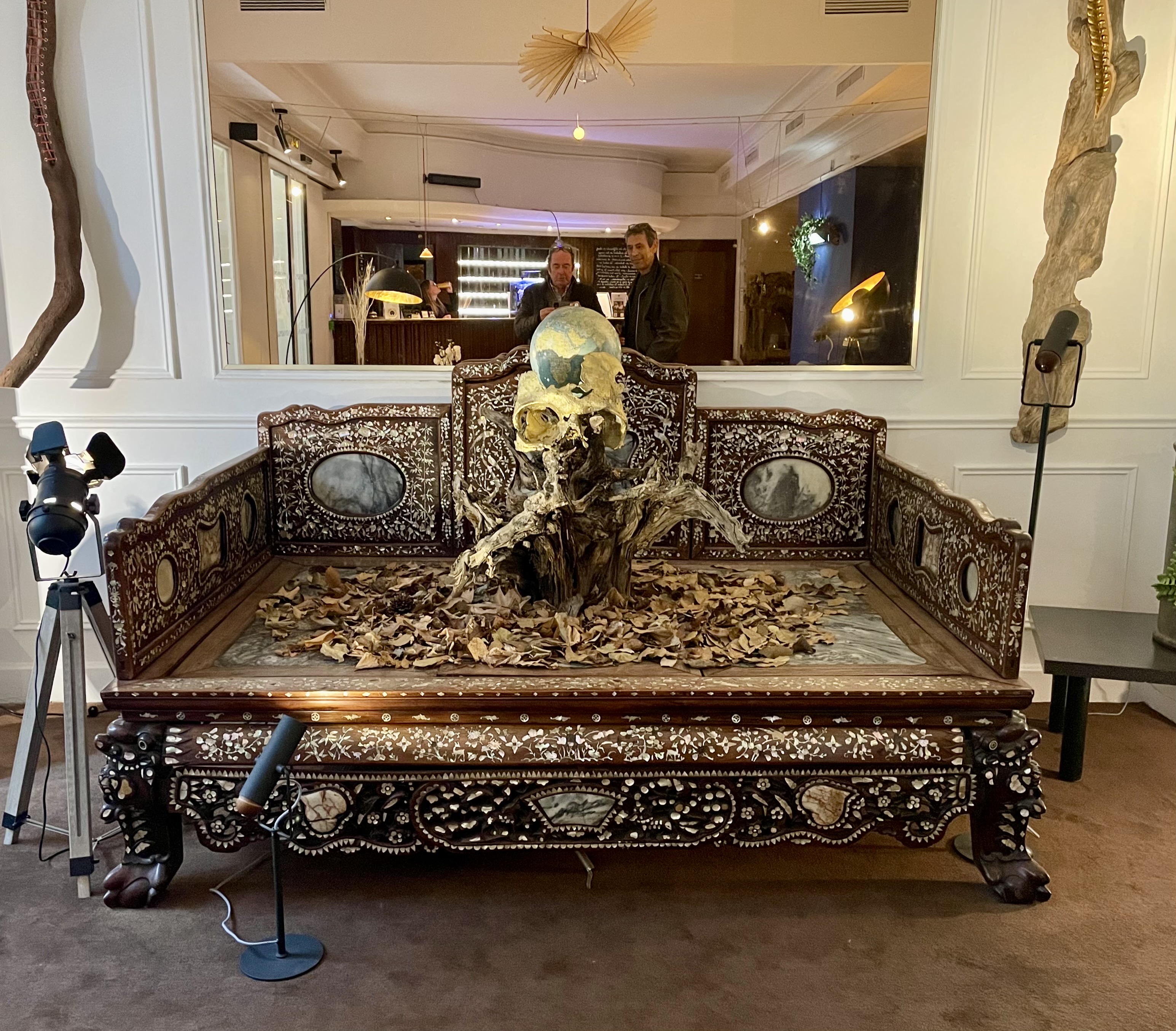 Dans cet hôtel déjà original par la quantité d’œuvres d’art présentées et ses chambres repensées par des artistes de renom, cette nouvelle exposition nécessitait une approche délicate. Astreint à une certaine réserve, Nicolas a fait en sorte d’éviter la morbidité d’œuvres composées d’os grâce à une scénographie qui les intègre parfaitement dans le charmant salon.