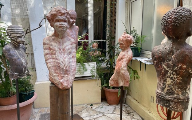 Dans un petit espace intérieur ensoleillé, les remarquables bustes de pierre de Fondacaro, et tout au bout, Lo Moulis s’est attribué la salle de bain pour faire flotter de petites photos et ses mèches de cheveux pendant que semblent s’envoler ses robes de tissus diaphane.