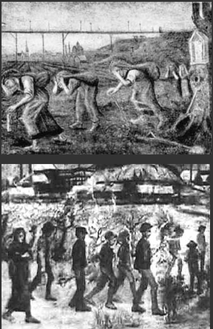 Tu t’es senti ce jour-là abandonné, rejeté, comme si tu avais fait quelque chose de mal et qu’on te punissait. Tes frères et sœurs restaient à la maison, et toi, on t’exilait. Ta frustration a été immense. Ce sentiment d’abandon, mélangé de punition et d’exil va te poursuivre toute ta vie. Il explique ton caractère solitaire, mélancolique. On le retrouve dans beaucoup de tableaux où on voit des grandes étendues vides, donnant une impression de solitude, comme si tu étais seul au milieu d’un dėsert. Je pense à une aquarelle du Borinage où on voit une toute petite silhouette perdue au milieu des immenses champs de mines.