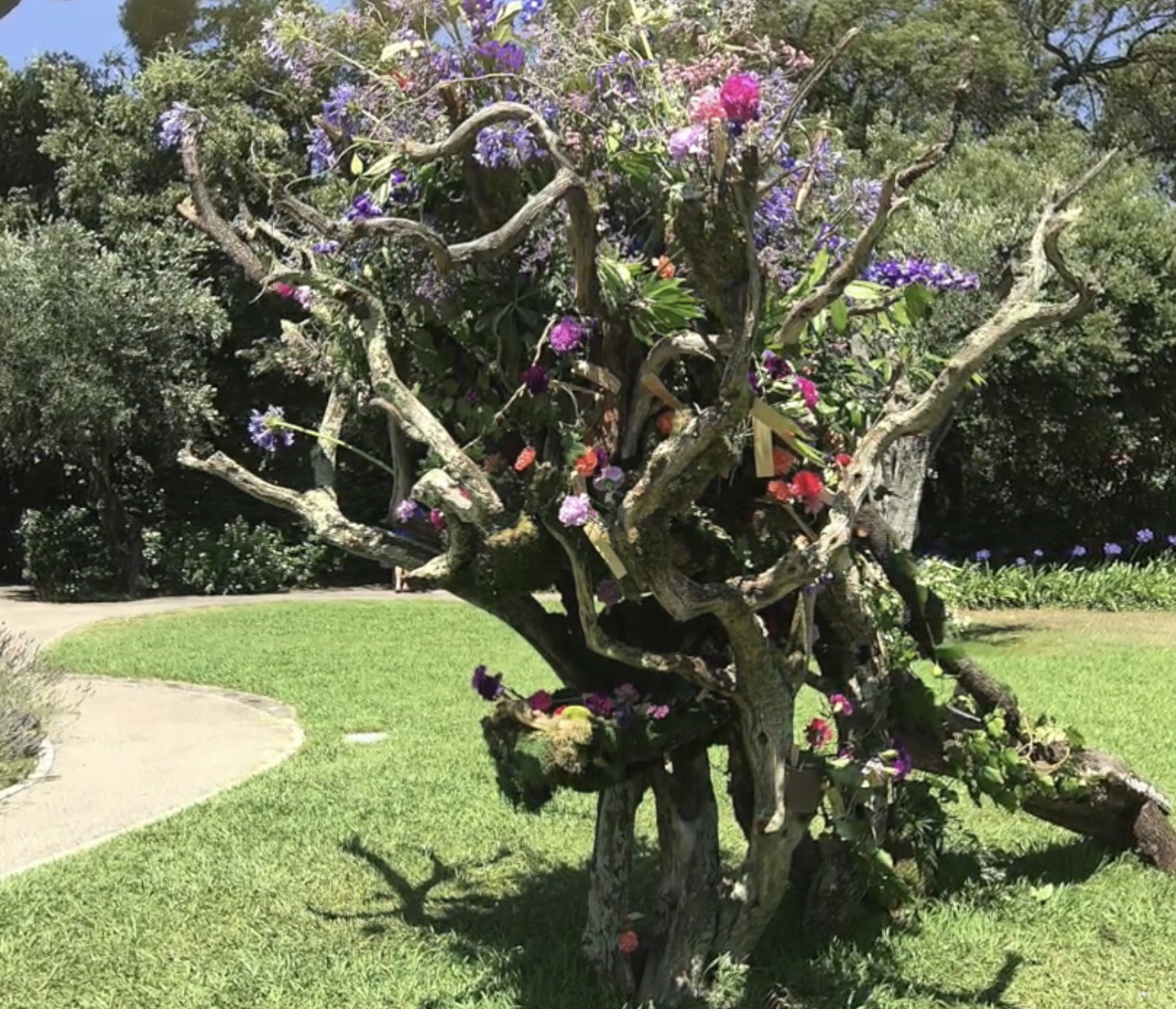 Comme un peintre, elle joue avec les couleurs et les formes : bouquets, parterres de fleurs, vénérables oliviers piqués de taches de couleurs subtiles s’inscrivant dans les nœuds du bois. Elle a créé également une véritable sculpture vivante constituée de branchages, de feuilles, de fleurs mêlées de mousses et d’écorces pour laquelle elle a demandé la participation des visiteurs qui ont pu y ajouter d’autres fleurs ainsi que des messages.