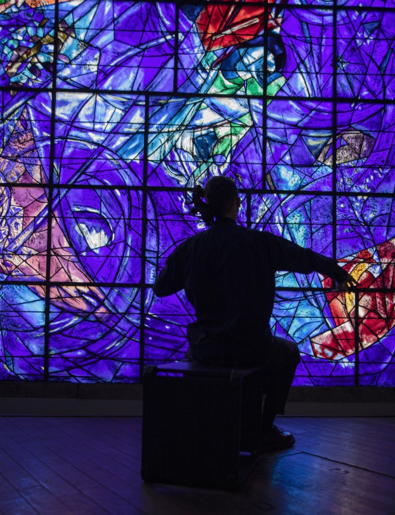 Wave Creation, ilia Osokin face à des vitraux de Chagall, dont un seul vitrail est reproduit : vitrail La création du monde, Les quatre Premiers Jours, 1970 © Vitrail de Marc Chagall réalisé en collaboration avec Charles Marq / Adagp, Paris 2023.