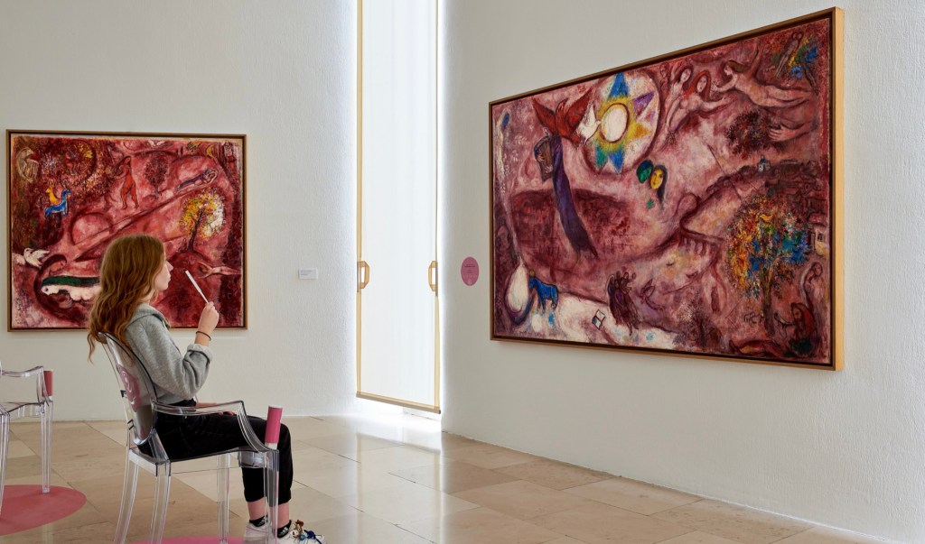Marc Chagall, série Le Cantiques des Cantiques I, 1960) et Cantique des Cantiques V, 1965-66 (huile sur papier rentoilé), avec dispositif olfactif pour découvrir les fragrances créées par Jean-Claude Ellena. Nice, musée national Marc Chagall. Scénographie : © Maddalena Giovannini, 2023. Photo : © musées nationaux du XXe siècle des Alpes-Maritimes / Anthony Lanneretonne © ADAGP, Paris, 2023