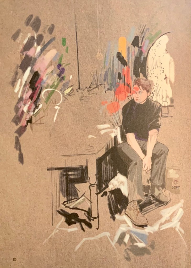 D’autres doubles pages sont consacrées aux maîtres de Bacon : un Van Gogh aux corbeaux ou Picasso envahi par ses œuvres et des dessins d’amis. On y croise Ezra Pound, Michel Leiris, Lucian Freud, les amants de Bacon.