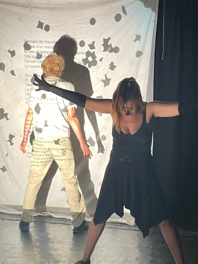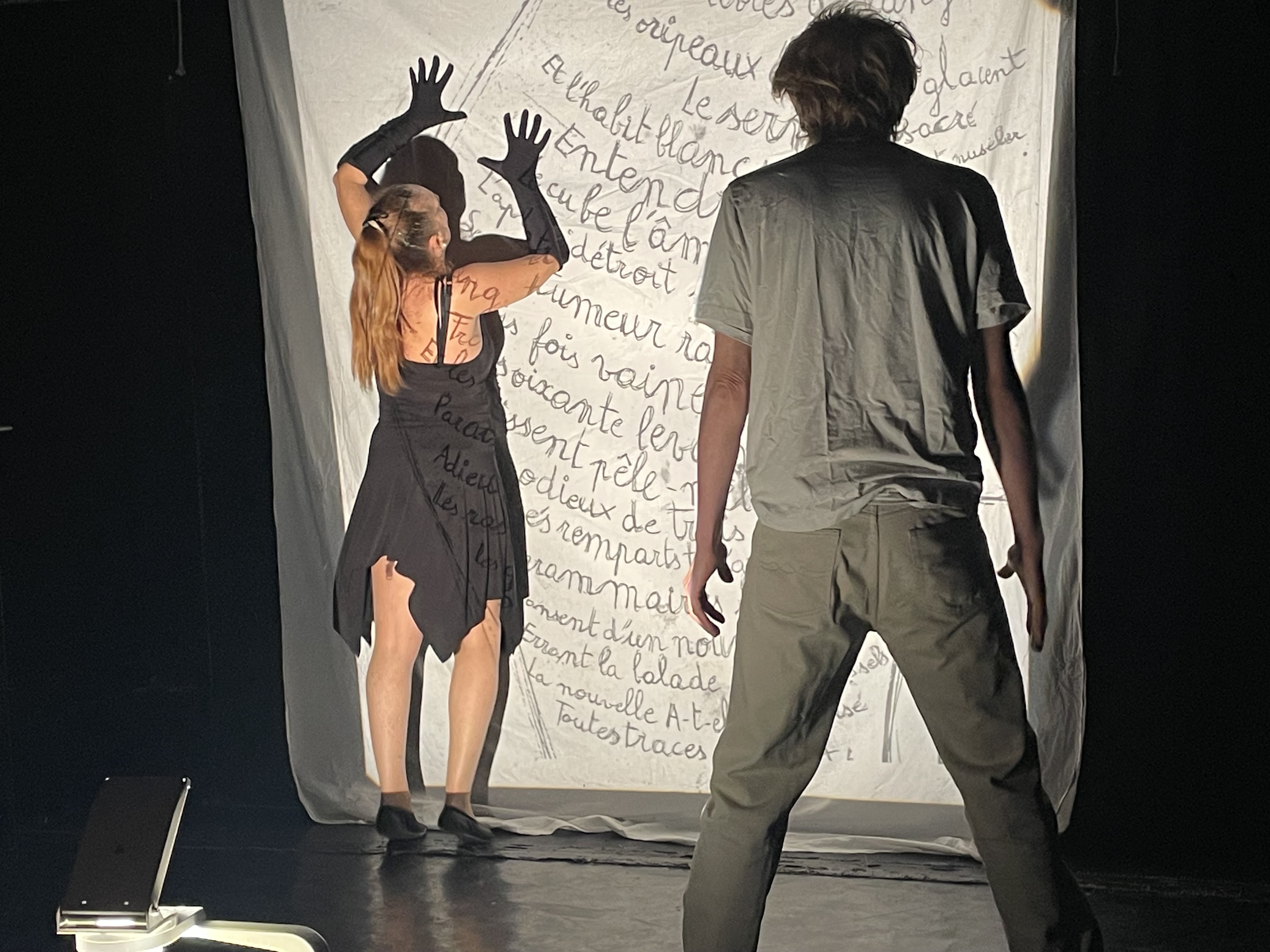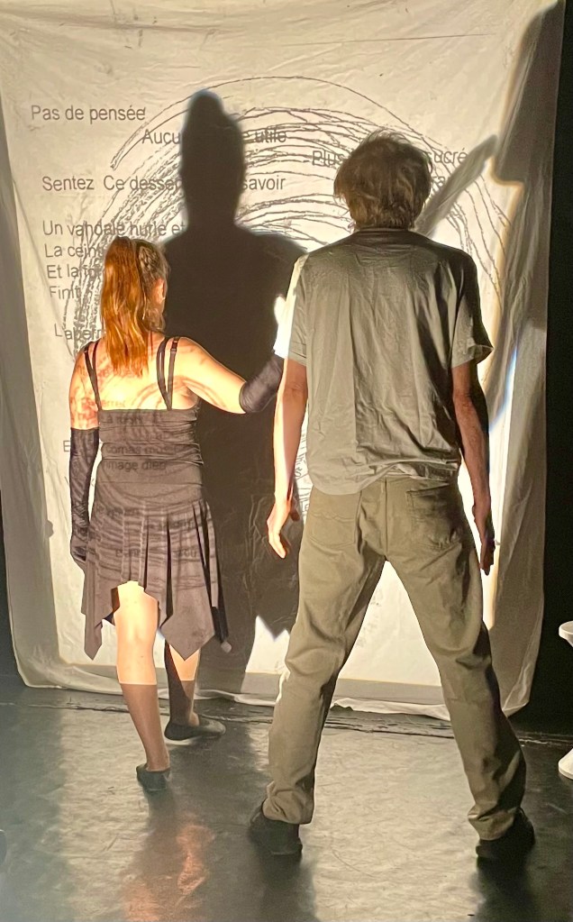 Un spectacle étonnant et poétique. Sur un écran sont montrés des pages de texte que Jean-Paul Ducarteron déclame dos au public pendant qu’une danseuse recouverte des mots projetés évolue sur la scène.