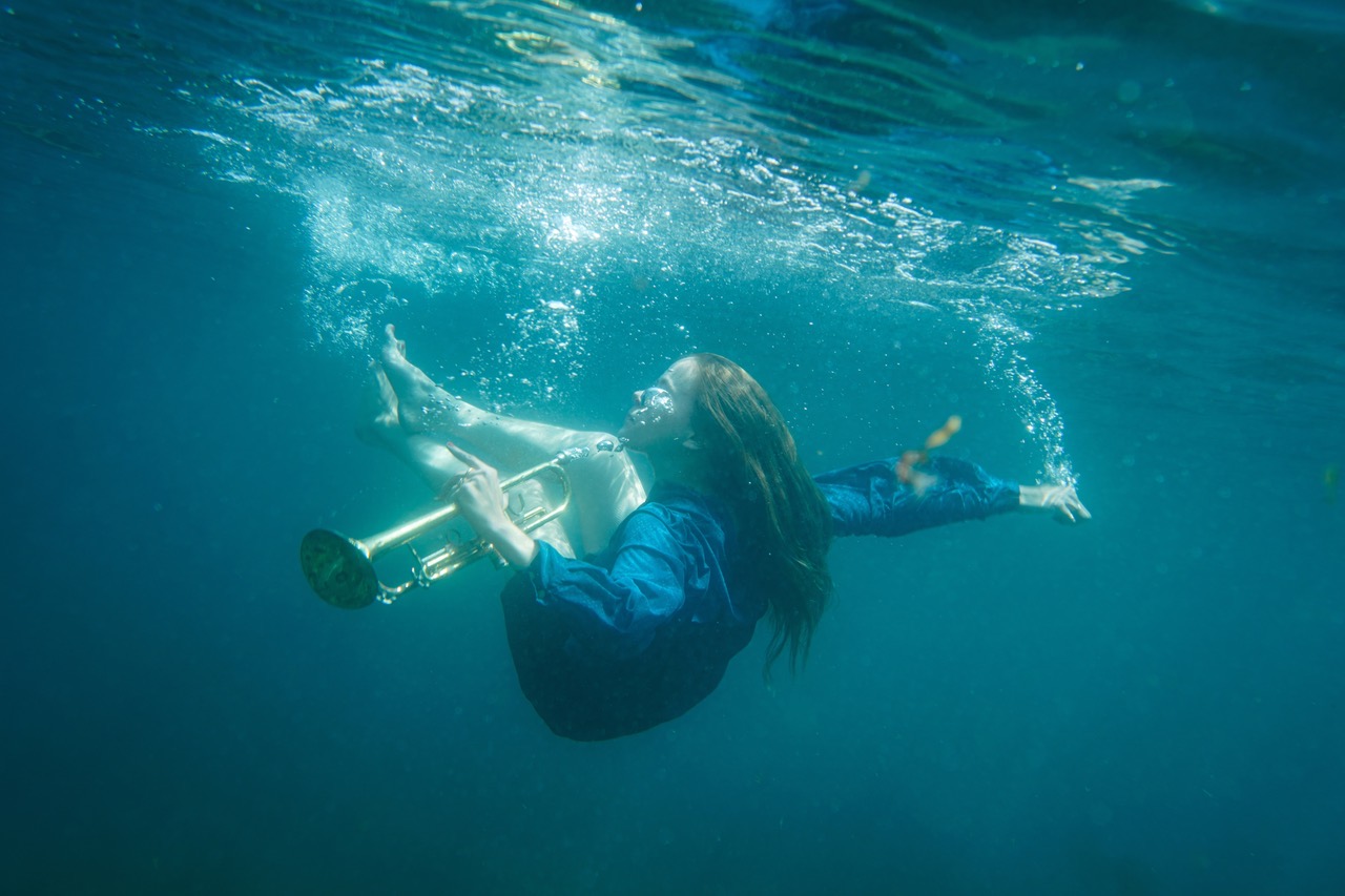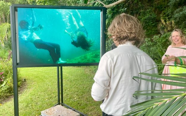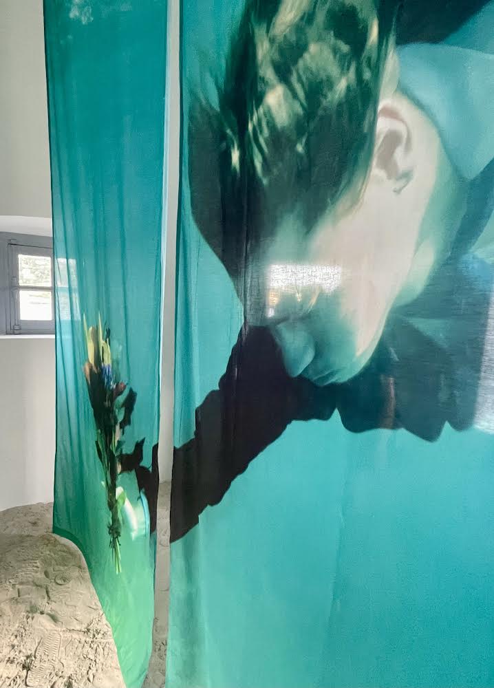 Dans une échauguette dominant la mer, une grande photo imprimée sur un voile très fin insiste sur le sentiment de légéreté et de vol qu’on peut ressentir dans la nage sous-marine.