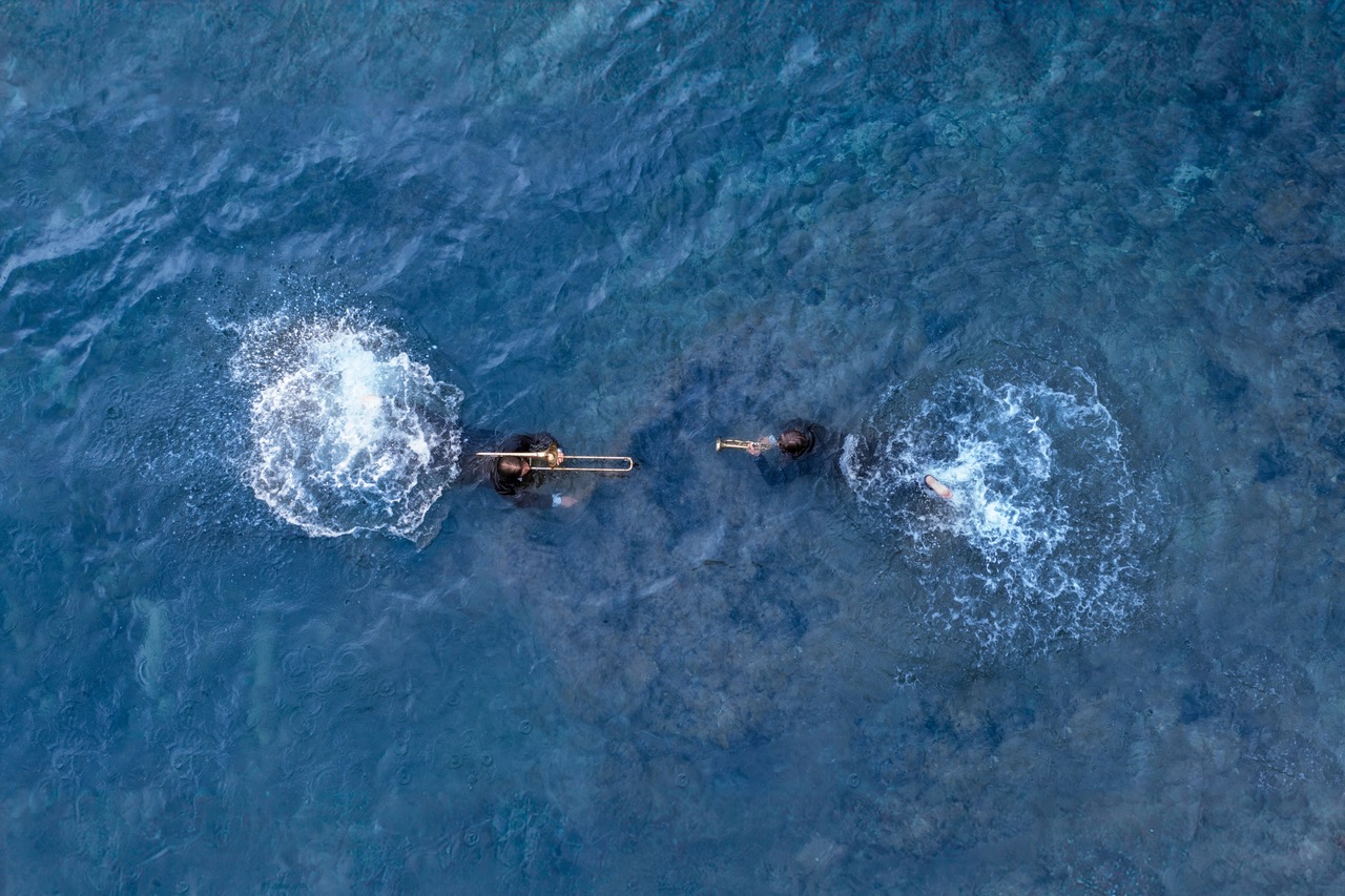 Pour l’exposition « Symphonie Sous-Marine » qu’il propose dans la superbe citadelle, à quelques mètres des eaux de la Rade de Villefranche, de grandes et belles photographies (prises de vues sous-marines, sub-marines ou par drone) où le bleu et le turquoise dominent nous apparaissent d’abord comme autant de compositions aux couleurs vives qui font contraste avec le vert des jardins. Quand on s’approche, on distingue les baigneurs dans leurs rondes marines ou dans des danses solitaires accompagnées d’instruments de musique inaudibles.