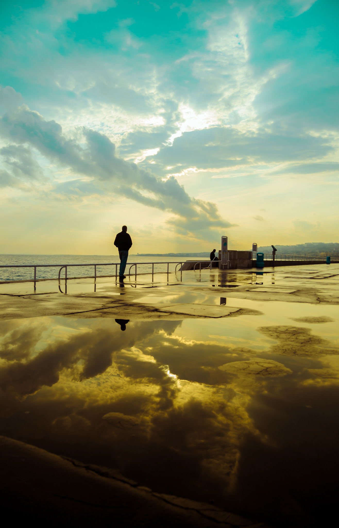 Les « visions » de Hatsuo apparaissent presque oniriques, comme cette silhouette d’homme sur la Promenade qui regarde la mer. Il vient de pleuvoir, les flaques d’eau reflètent un ciel troublé. Dans ce paysage, la terre, la mer et le ciel se mêlent dans un maelström de couleurs, avec la silhouette de l’homme comme unique point de repère pour donner du sens à l’ensemble.