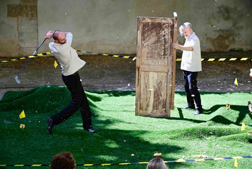 La mise en scène de Joël Flesel est singulièrement loufoque : un terrain de golf sur lequel un engin de chantier se balade et sous lequel sont déterrés des crânes et un blouson d’enfant.