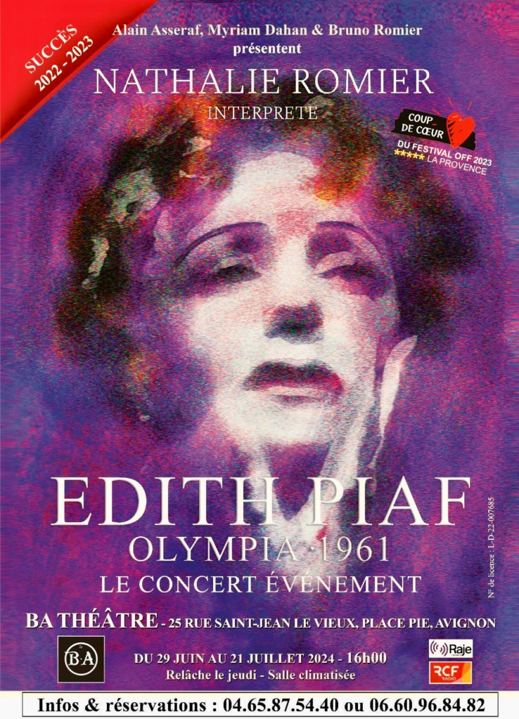 C’est ce concert devenu culte que Nathalie Romier, grande interprète de Piaf depuis des années nous fait revivre avec toutes les chansons dans leur ordre de passage et avec la même scénographie. Dans un film réalisé à l’époque, on revoit Bruno Coquatrix et ses amis. L’Olympia, menacé de disparition à cause de problèmes financiers, a été sauvé grâce à cette série de concerts, particulièrement émouvants car Edith Piaf était très malade et le public sentait bien que c’était peut-être la dernière fois qu’il la voyait.