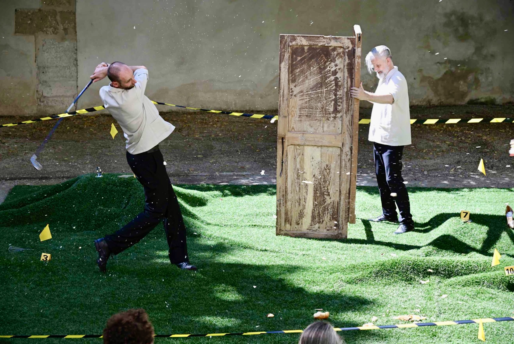 La mise en scène de Joël Flesel est singulièrement loufoque : un terrain de golf sur lequel un engin de chantier se balade et sous lequel sont déterrés des crânes et un blouson d’enfant.