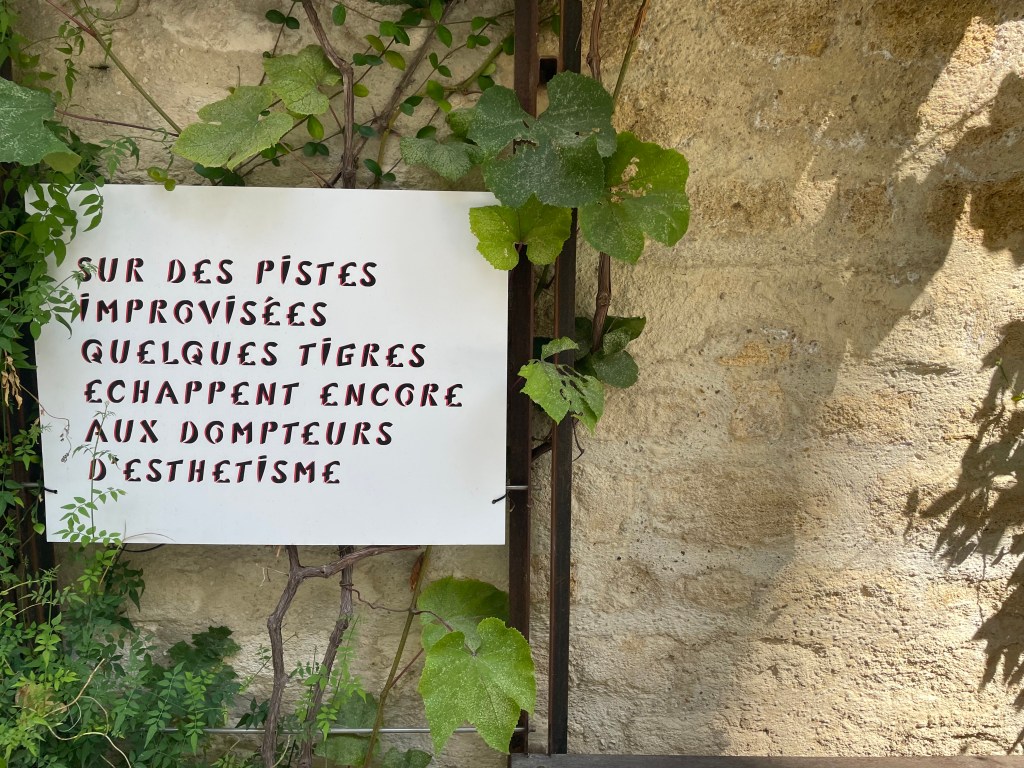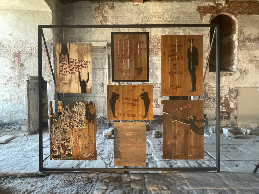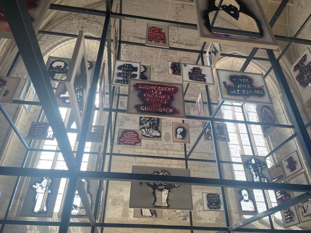 Dans cette exposition un peu brouillonne, un bel ensemble de ses œuvres (300 en tout) est présenté. Les supports sont variés : palissades, photos de murs, reproductions présentées dans le jardin, dans les salles… Les matrices de pochoirs – le cœur de son travail – sont suspendues en l’air (on aurait aimé les voir de plus près). Quelques vidéos montrent l’artiste au travail, toujours clop à la main.