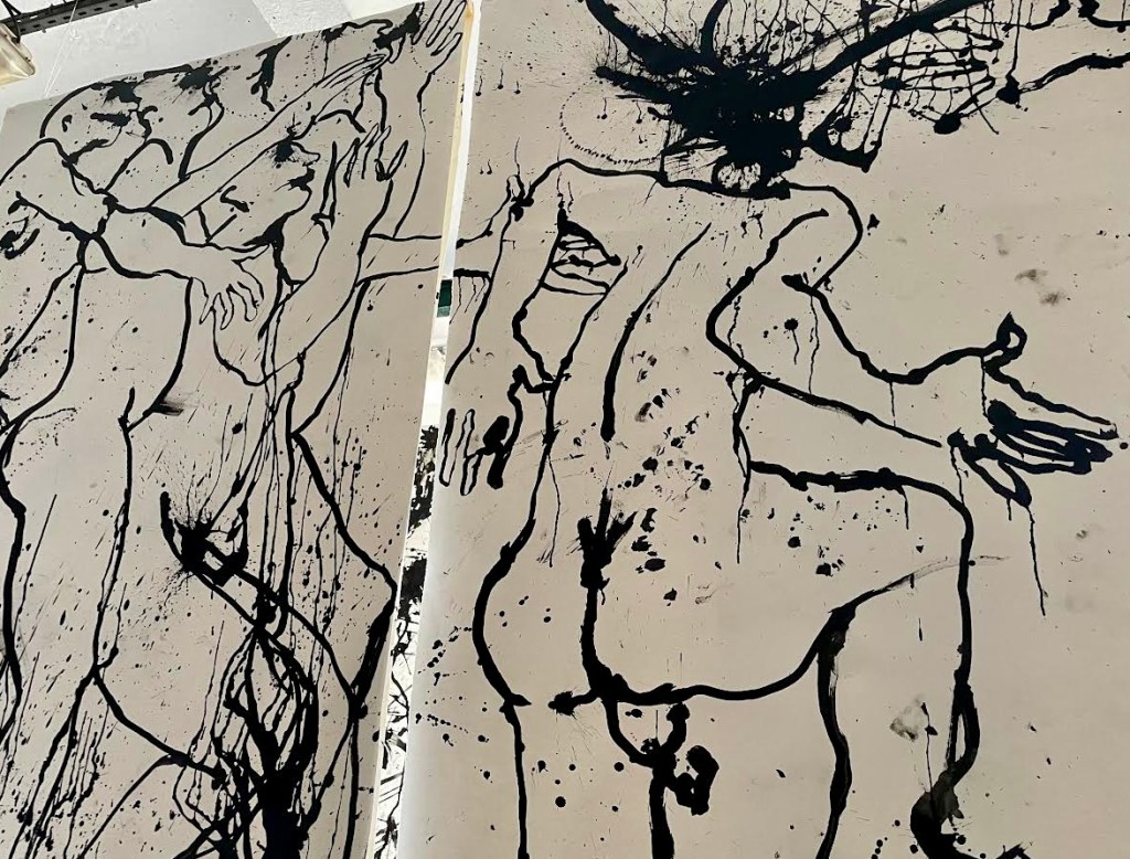 Dans l’impressionnant moulin à huile Frédéric Fénoll présente ses beaux et grands dessins expressionnistes à l’encre de Chine, un travail puissant sur le surgissement de la forme humaine à travers le geste violent d’un artiste inspiré.