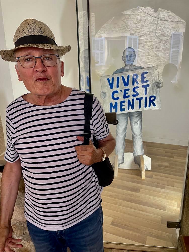 De retour au cœur du village, dans une vitrine, une œuvre de Manto présentant son autoportrait tenant un panneau sur lequel est écrit : « vivre c’est mentir », une œuvre destinée à être provocante.