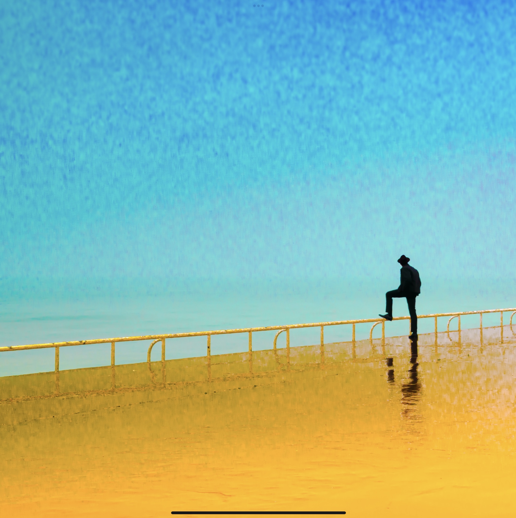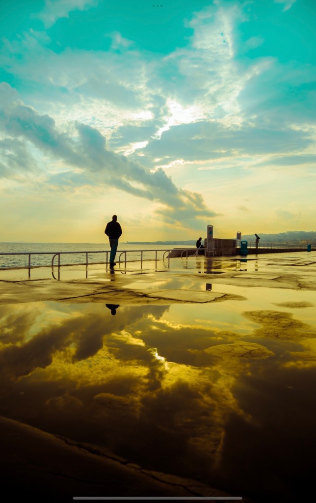 Il vient de pleuvoir, les flaques d’eau reflètent un ciel troublé. Dans ce paysage, la terre, la mer et le ciel se mêlent dans un maelström de couleurs, avec la silhouette de l’homme comme unique point de repère pour donner du sens à l’ensemble.