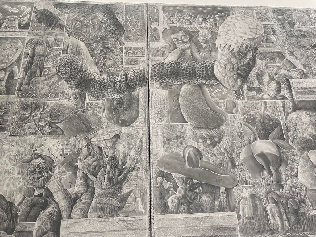 Les psychanalystes pourraient s’interroger sur l’inconscient de l’artiste, c’est pourtant un jeune homme sage aux cheveux gris et blancs comme ses dessins. Il est pondéré, sait ce qu’il fait et en parle posément.