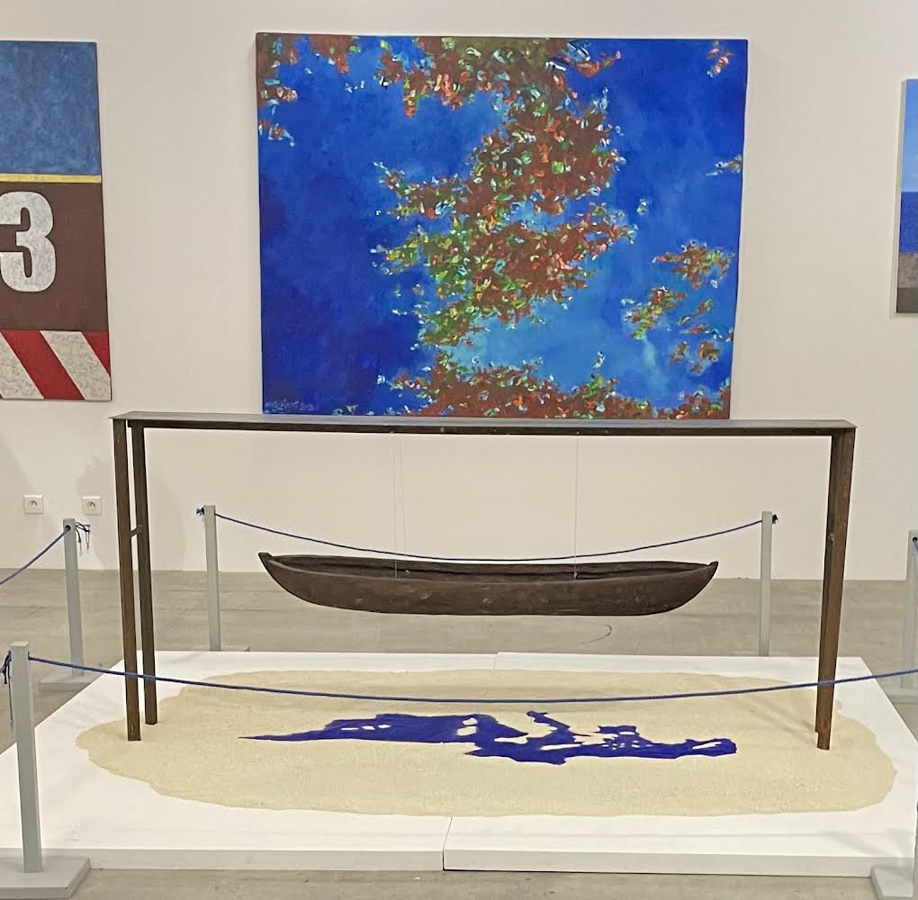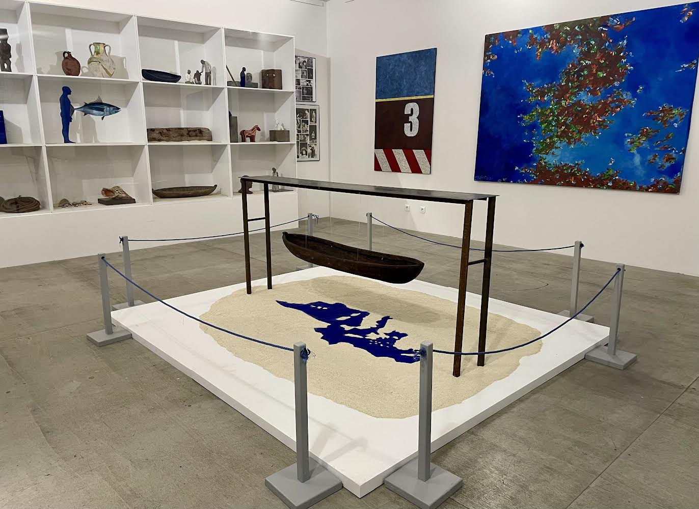 Au milieu de la salle », une barque sculptée en suspension domine une mini Méditerranée de sable doré et de pigments bleus.