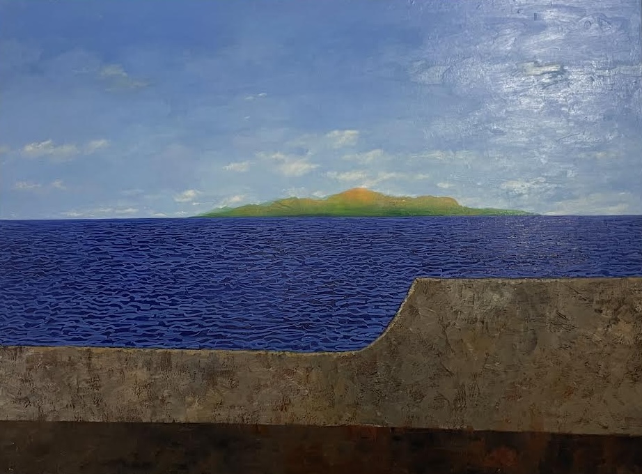 Sur les murs, des peintures racontent des épisodes du voyage ancestral sur la Méditerranée : une d’entre elles montre des voyageurs auprès du navire, dans l’attente d’un départ pour l’incertain, l’inattendu, l’improbable, dans l’espoir d’un El Dorado, en tous cas, d’un ailleurs à découvrir. Sur la mer où sous la mer… Une toile toute bleue condense cet univers : le penseur/rêveur est assis sur le sable, au milieu de poissons transparents qui passent tranquillement devant lui, les lumières au-dessus. Une autre grande toile montre des fonds marins faits d’éclats de peintures recollés sur la toile, se mêlant aux touches.