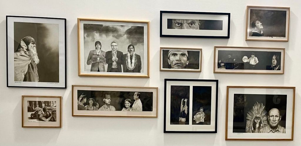 Depuis des années, l’artiste ne cesse de le remplir de voyageurs réels et imaginaires, célèbres ou inconnus : artistes, poètes, shamans…. Certains ont déjà atteint des rives inaccessibles : Picasso, Pollock, Pasolini, Giacometti, Borgès, La Callas, Frida, Toto, Iggy Pop, Moondog, Fellini, Prévert, Casa, violoniste et clochard céleste niçois… D’autres sont encore là, sur ce bord du quai de la vie : Begnini, Miquel Barcelo, Eliane Radigue, Pierrot « le jardinier », Laura, Louis Pasto, Janluc Sauvaigo, Adran Brody, Gregory Bakounov, Sebastiao Salgado, etc., tous immortalisés dans des encres de Chine sensibles de couleur sépia. Ils constituent un bel ensemble d’amis, d’inspirateurs, d’initiateurs, qui ont forgé l’univers mental de l’artiste et l’ont entraîné dans les courants mouvants de l’art, de la musique et de la littérature.