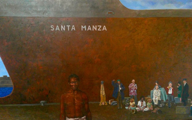 Une fois de plus, au sein du Palais Lascaris, le vieux palais du XVIIe siècle, résidence des Lascaris-Vintimille devenu musée, Maubert est prêt à nous embarquer sur la Santa Manza, un navire issu de son imagination, devenu réel par ses œuvres, à l’origine, un bateau longtemps resté à quai au port de Nice qui l’a fait rêver.