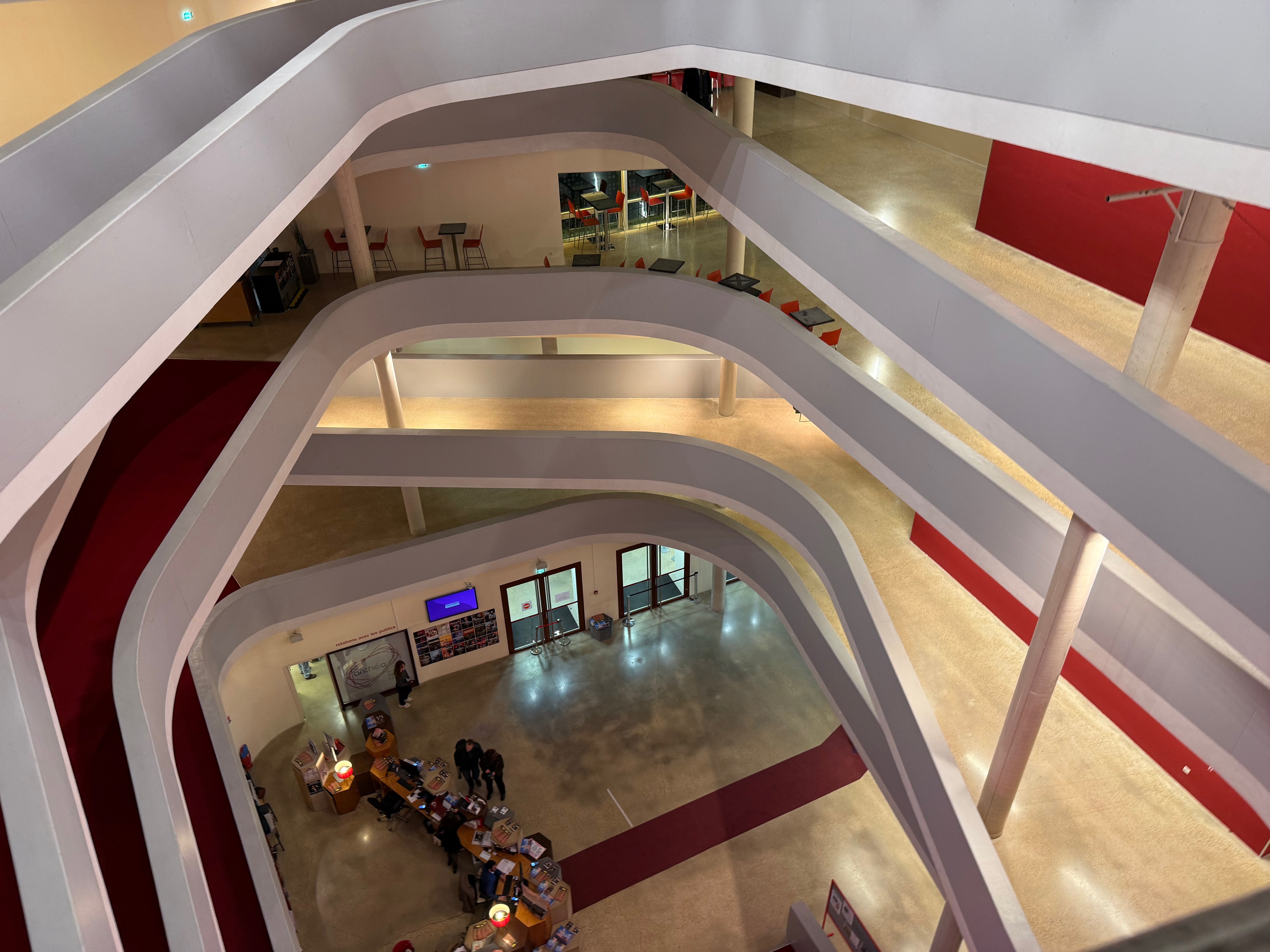 Mêlant une grande diversité de matériaux (béton matricé, verre, aluminium, acier Corten, bois et admirablement architecturé autour d’une rampe hélicoïdale centrale de cinq étages rappelant le Musée Guggenheim de New York, Anthéa contient un nombre important de loges, d’espaces de maquillage pouvant accueillir des orchestres symphoniques composés de deux cent musiciens. Tout en haut du bâtiment, nous avons découvert des équipements impressionnants : des rampes supportant les projecteurs et tout le matériel pour la lumière, 37 perches motorisées servant pour l’accrochage et les changements de décors, des plaques d’acier corten fixées au dessus du plateau pour une meilleure diffusion du son…