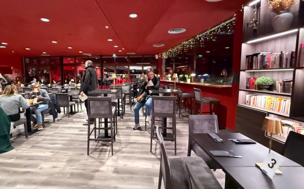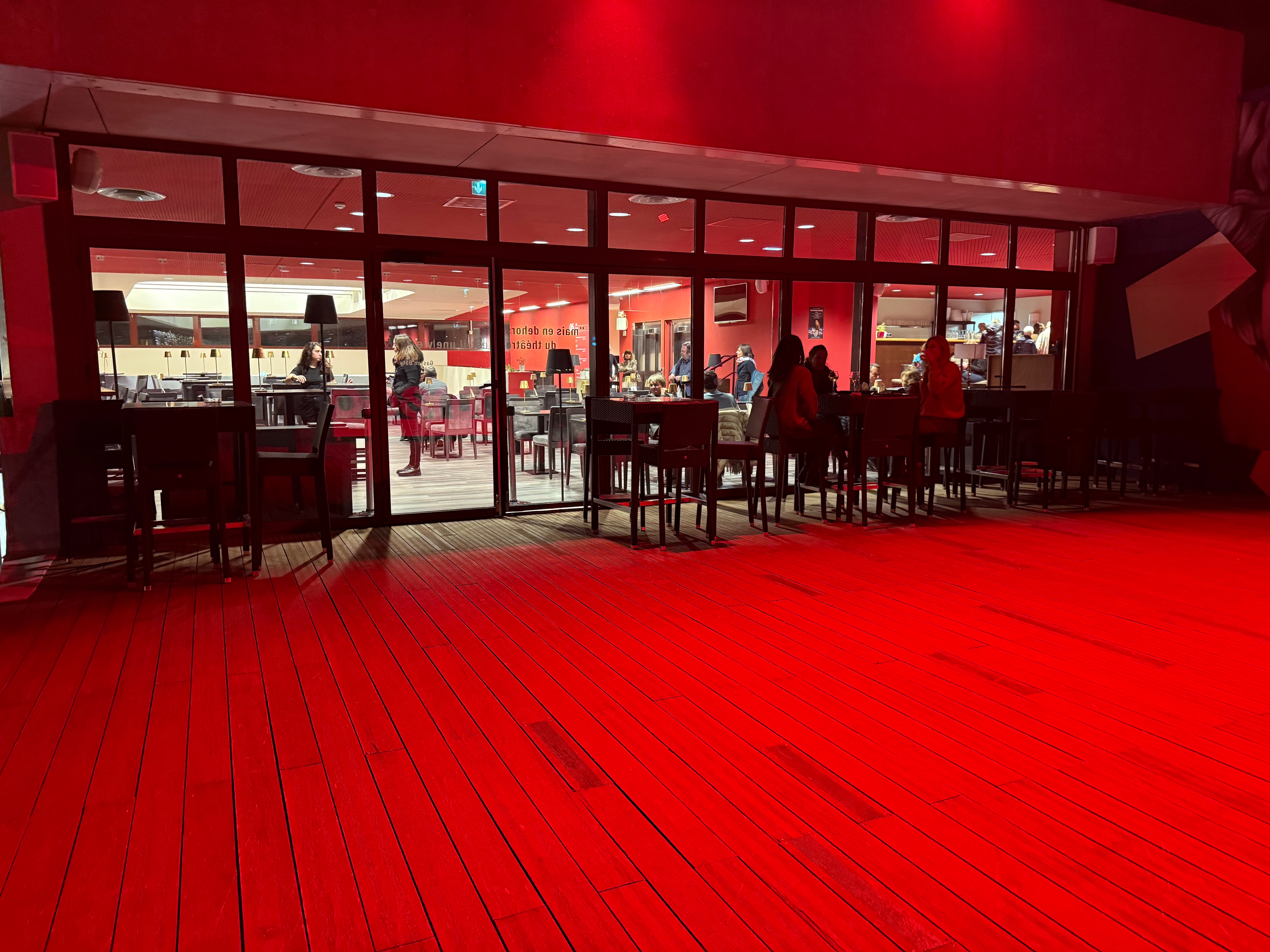 Une immense terrasse dominant la Baie des Anges (entourée de piscines et de terrains de tennis), accueille un bar-restaurant panoramique ouvert avant et après les représentations.