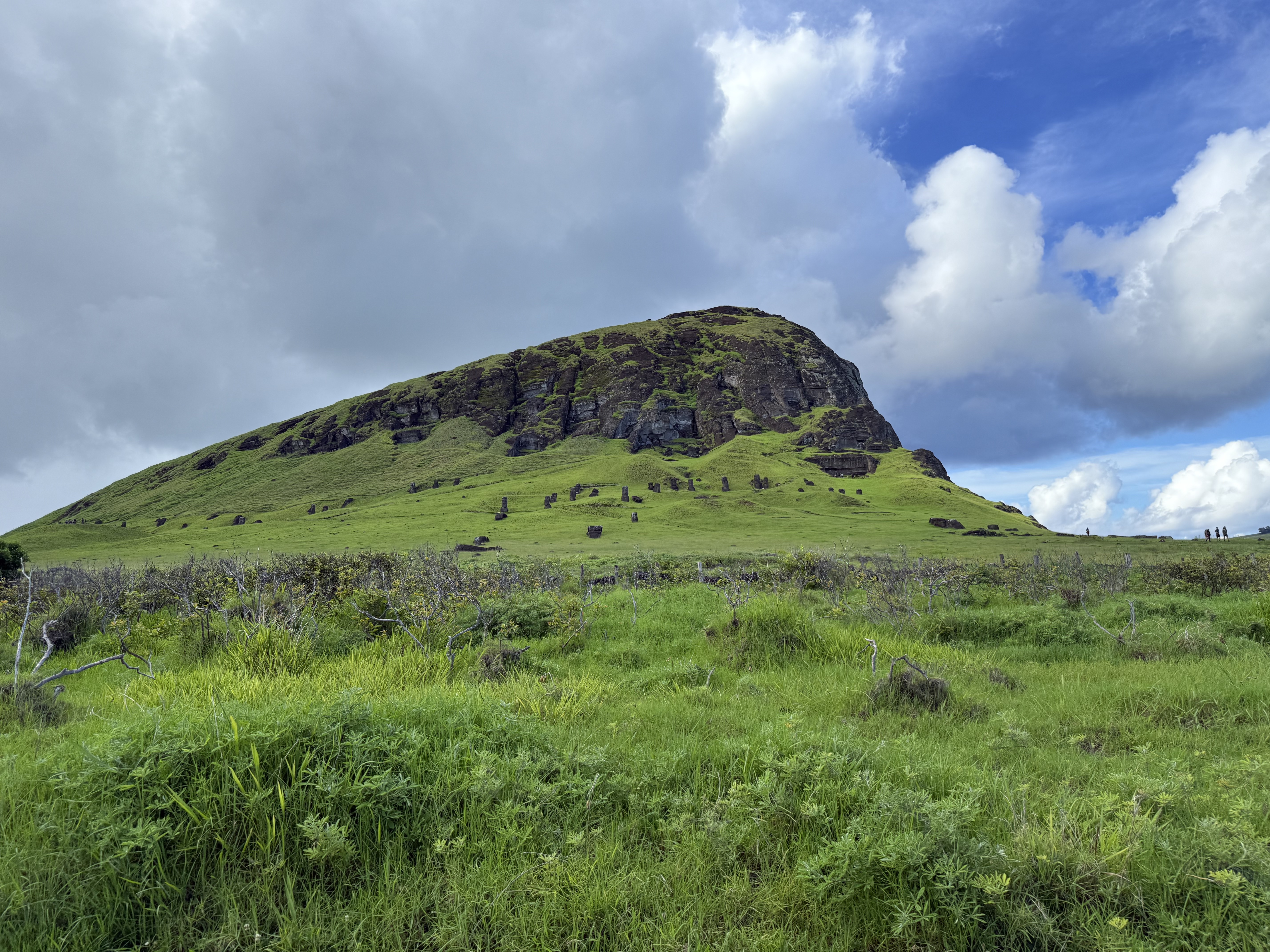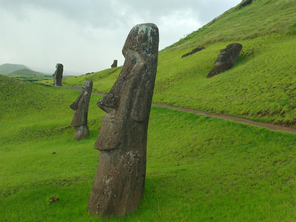 Les moaïs sont pratiquement tous sculptés dans une roche volcanique assez facile à travailler et issus du même volcan qui a servi de carrière : le Rano Raraku où des centaines de figures ont été sculptées dans la roche, certaines disséminées le long de routes invisibles qu’on suppose être les chemins qu’elles devaient emprunter pour rejoindre leurs destinations finales. D’autres ont été abandonnées, comme si on avait arrêté tout d’un coup d’y travailler, d’autres encore à peine ébauchées. Les centaines de visages et de corps plus ou moins dégagés de la roche peuvent être considérés comme une œuvre immense créée dans le temps (durant quelques siècles) et dans l’espace de l’ile. Ainsi cet ancien volcan devenu la carrière où est né l’art rapanui est un site archéologique majeur pouvant rivaliser le Machu Picchu, avec les pyramides de Gizé ou l’acropole d’Athènes…