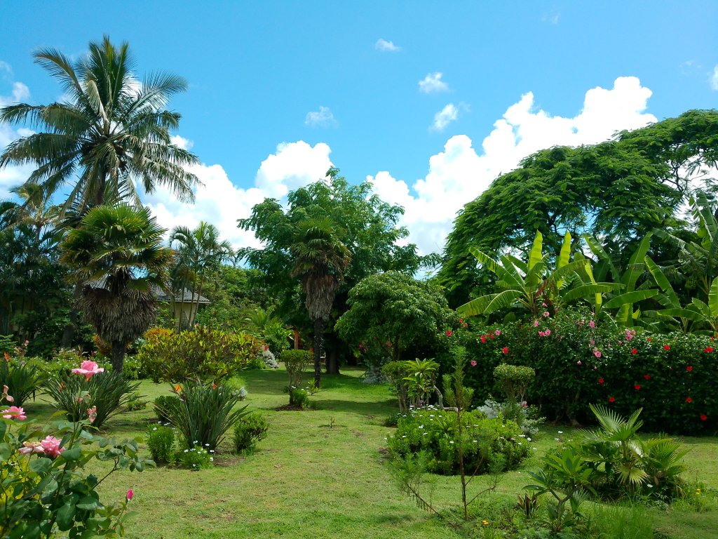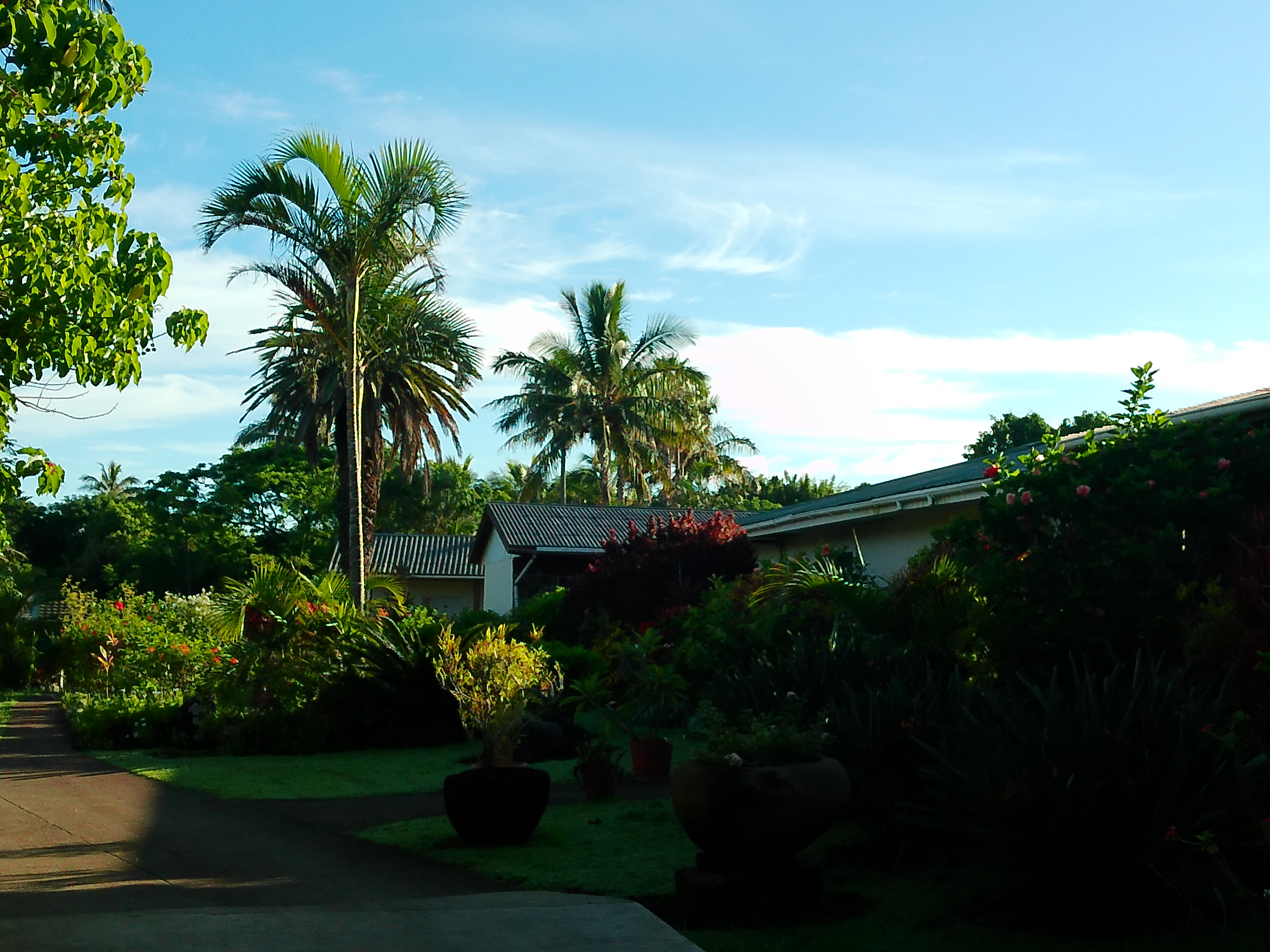 D’emblée, une ambiance tropicale nous saisit. On est accueilli avec un collier de fleurs passé autour du cou par le chauffeur du petit car venu nous récupérer.