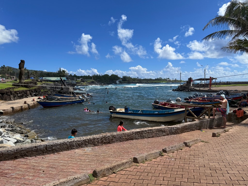 Première promenade à la découverte de Hanga Roa, ville principale de l’île. Au bout de la rue qui mène à l’hôtel, l’océan bien bleu et un tout petit port avec quelques barques de pêcheurs.