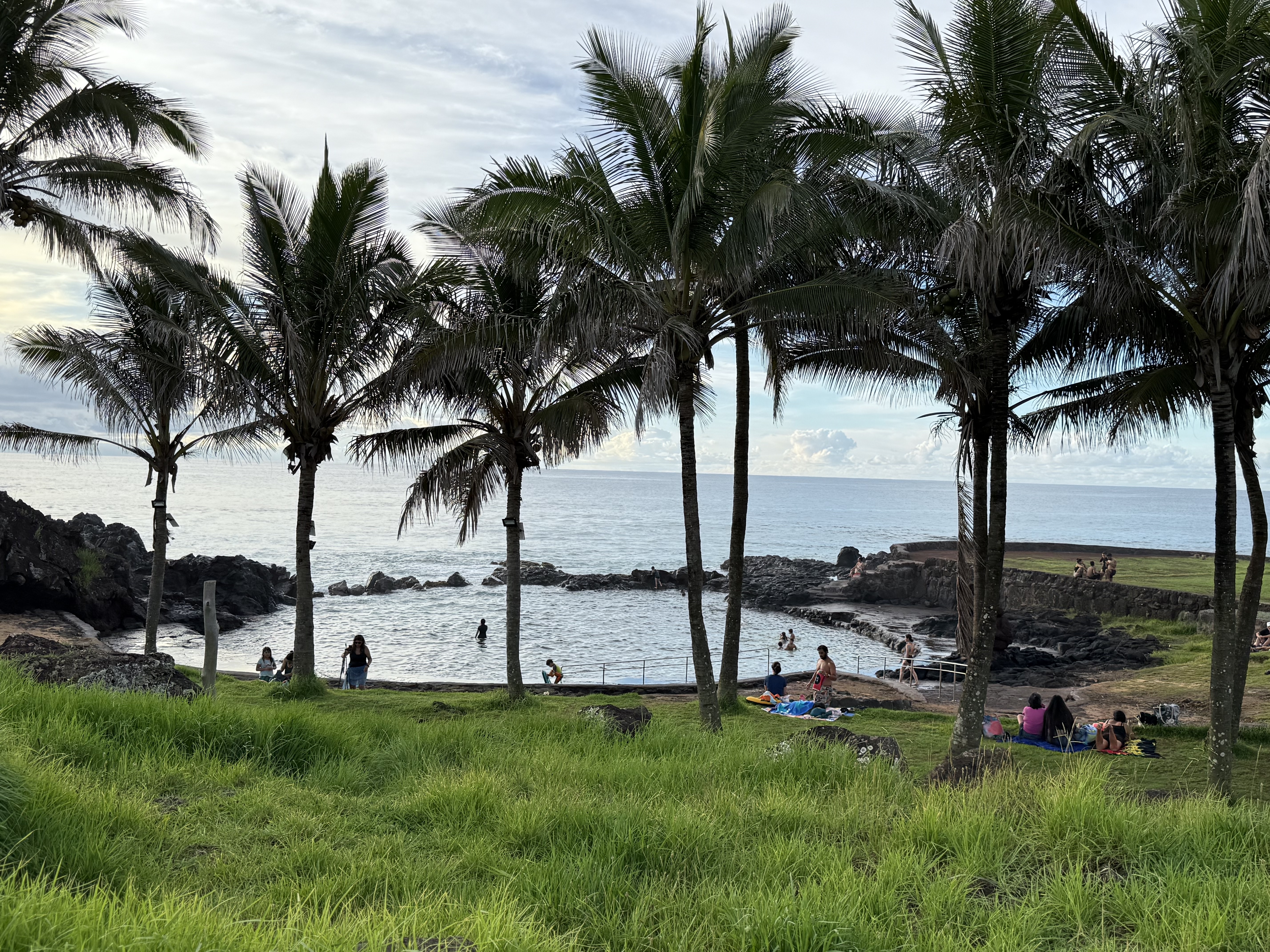 Un peu plus loin, une sorte plage a été creusée dans les rochers, une piscine naturelle entourée de plateformes lisses à escaliers qui mènent dans l’eau.