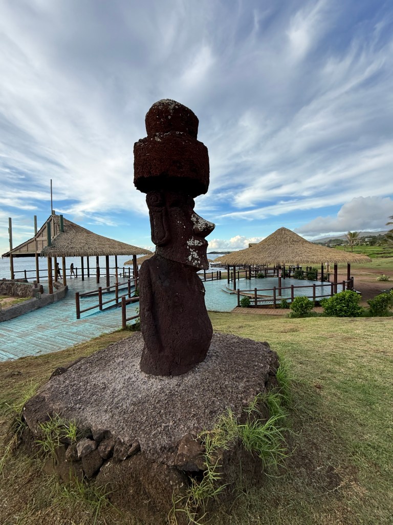 Un moaï est là, qui observe les maisons et le port, protégeant les pêcheurs.