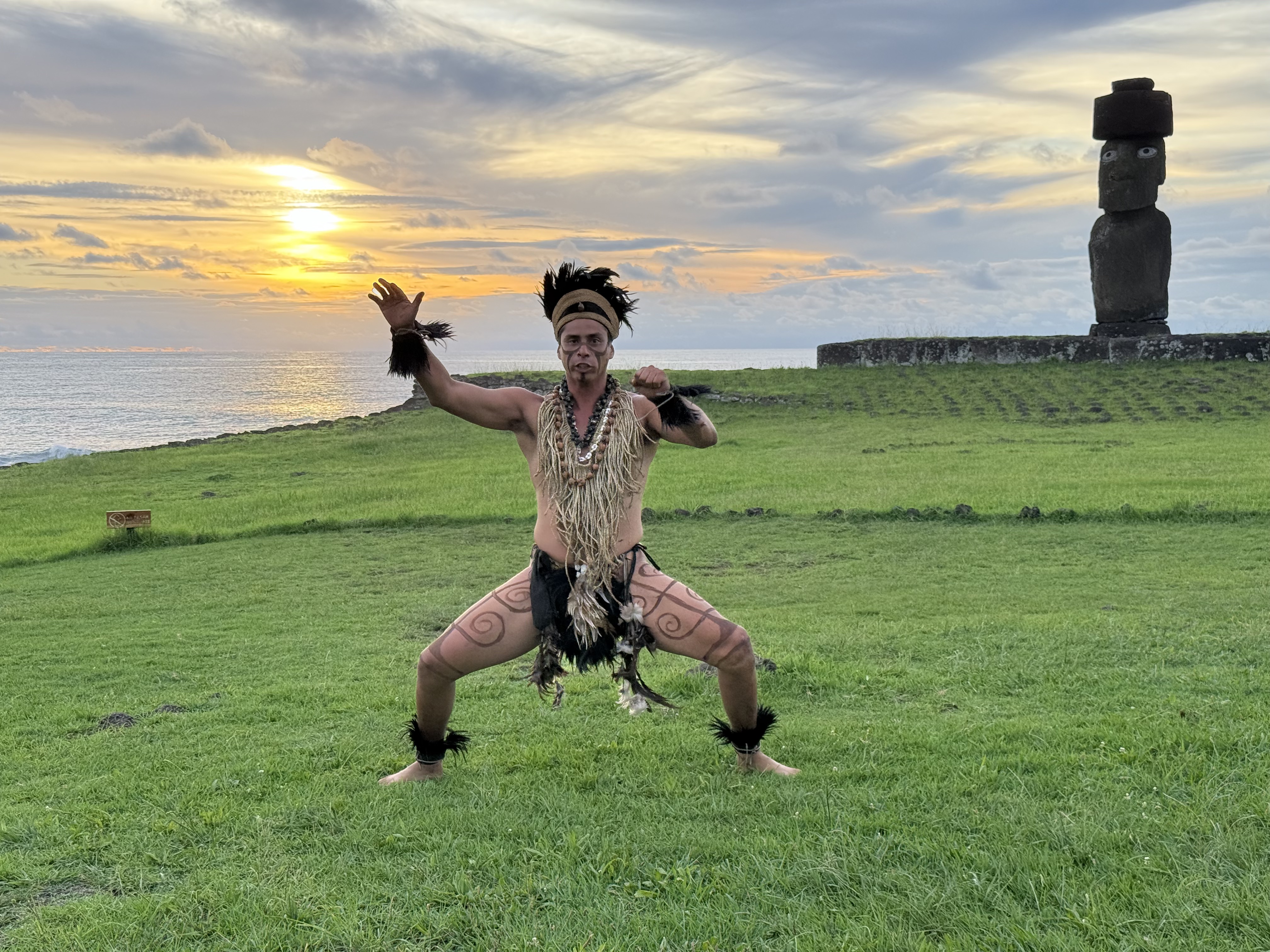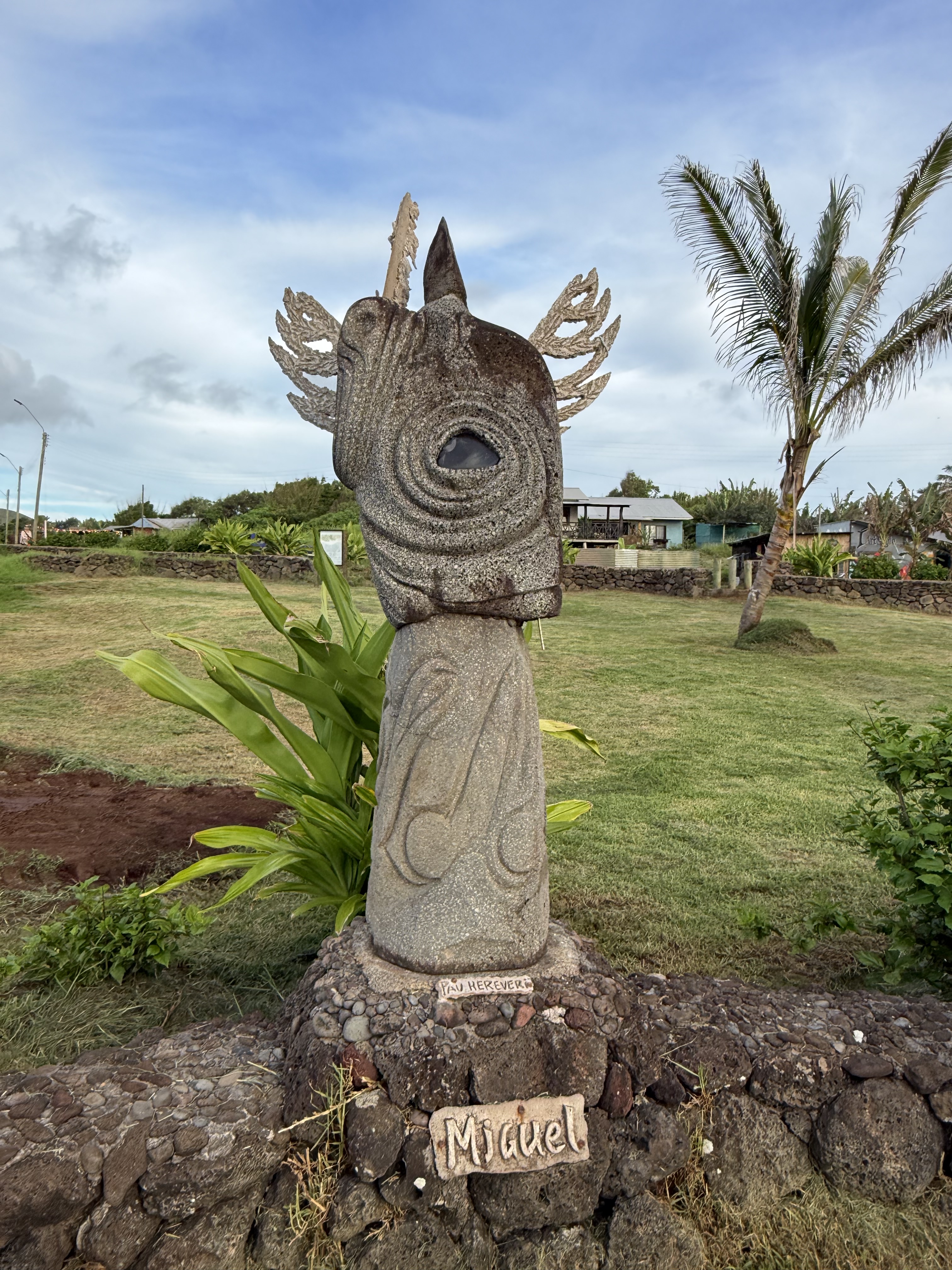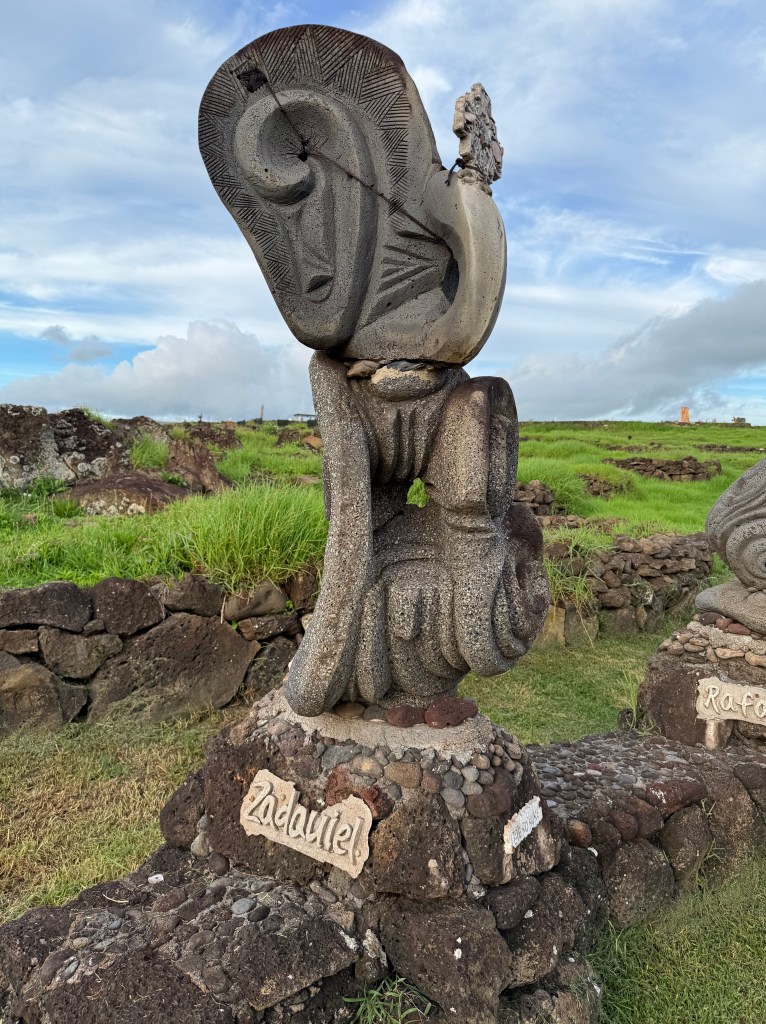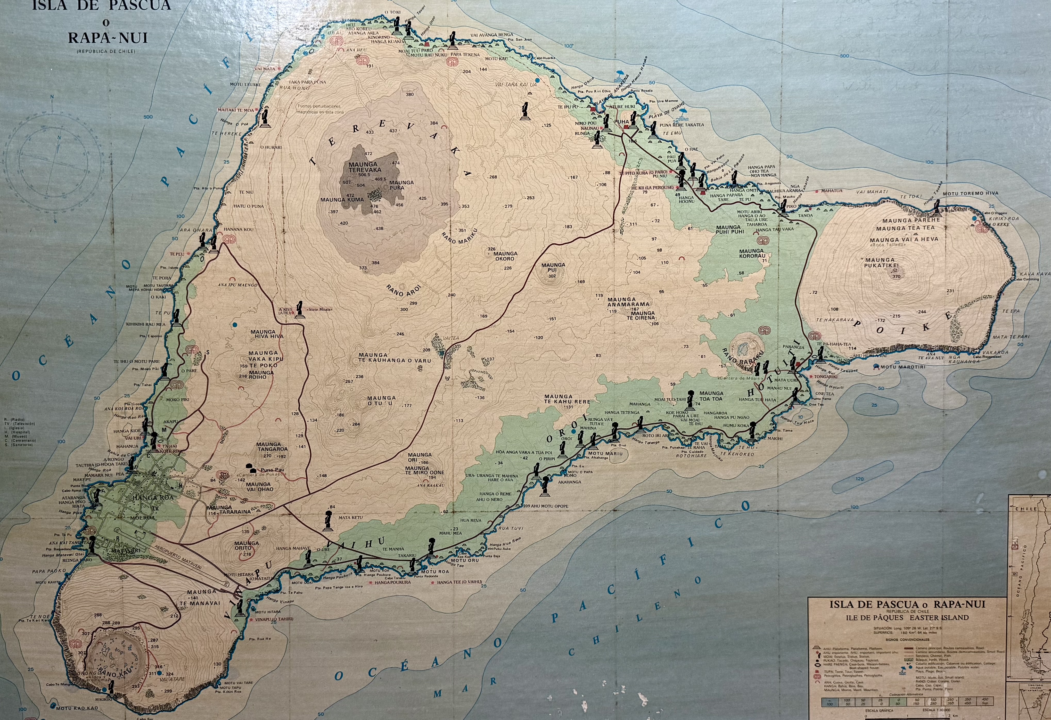 Visite de Rapa Nui, le vrai nom de l’île, le nom « Île de Pâques » lui a été donné par Jacob Roggeveen, un hollandais (le premier européen) qui y a débarqué le jour de Pâques 1722. Nous avons appris que cette île est née de trois volcans principaux très proches : le Poilke (3 millions d’années), le Rano Kau (2,5 millions) et le Terevaka (500 000 ans), si proches qu’ils se sont amalgamés. Ce qui a donné cette triangulation à l’île.Entre ces trois volcans, des vallées fertiles mises en valeur par le talent de cultivateurs des Rapanuis qui sont également d’excellents pêcheurs, ainsi l’abondance régnant, il n’y a pas eu de guerre ou très peu.