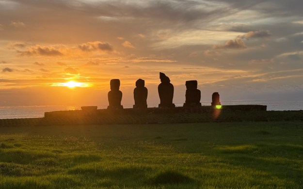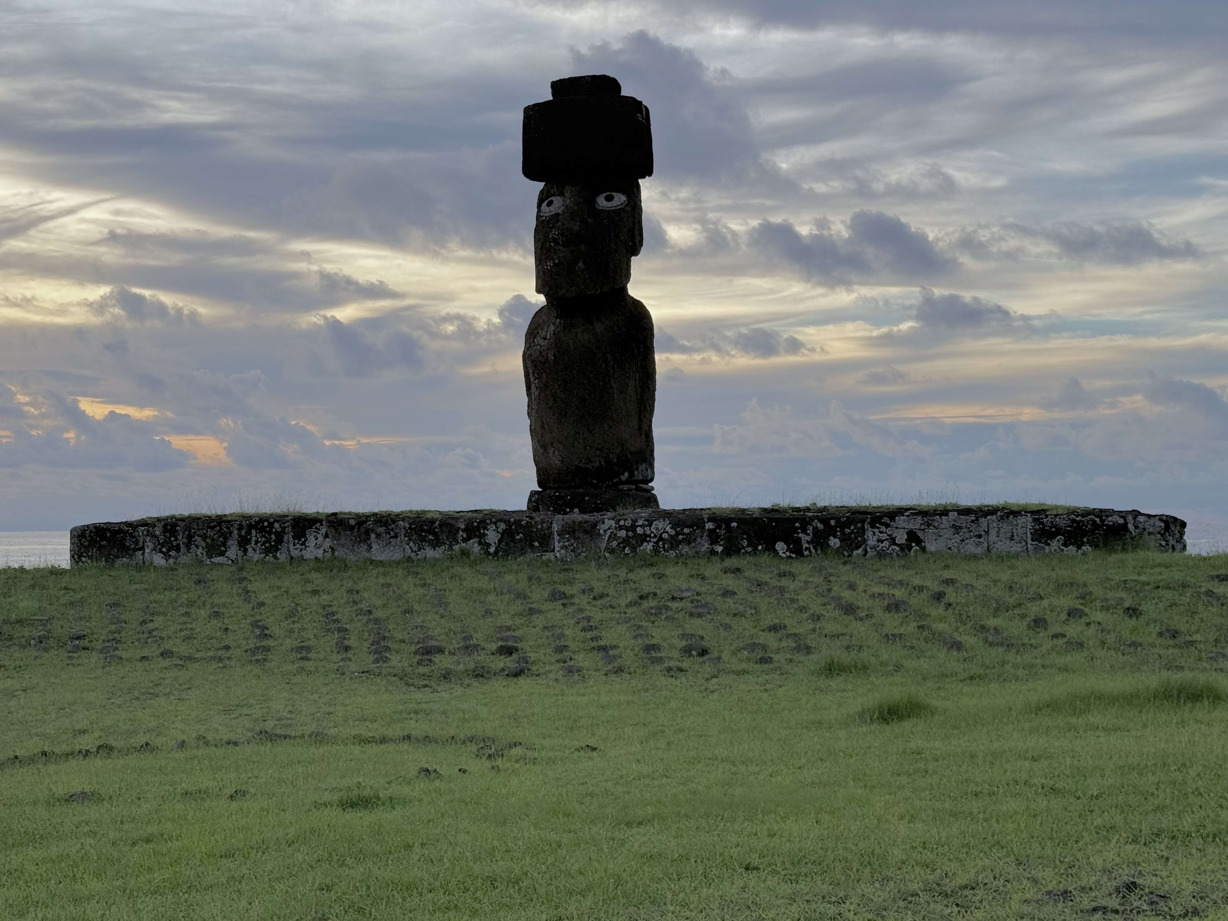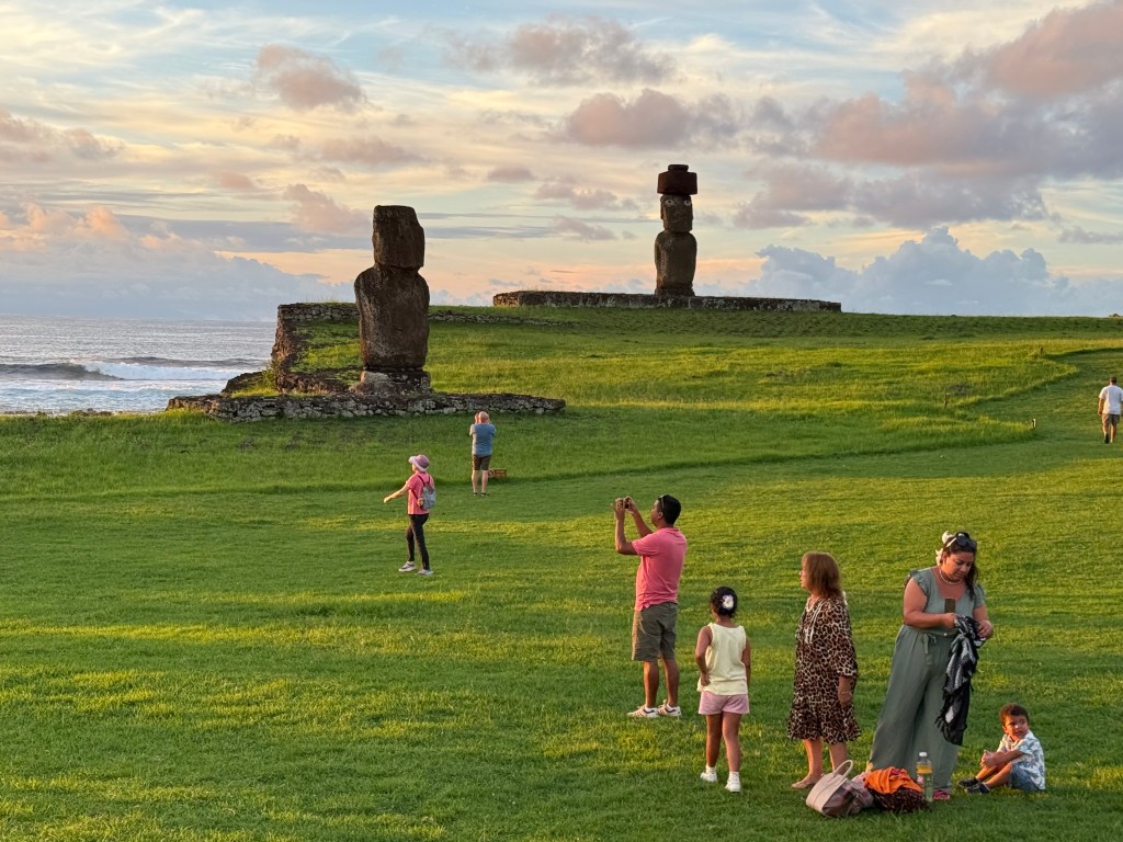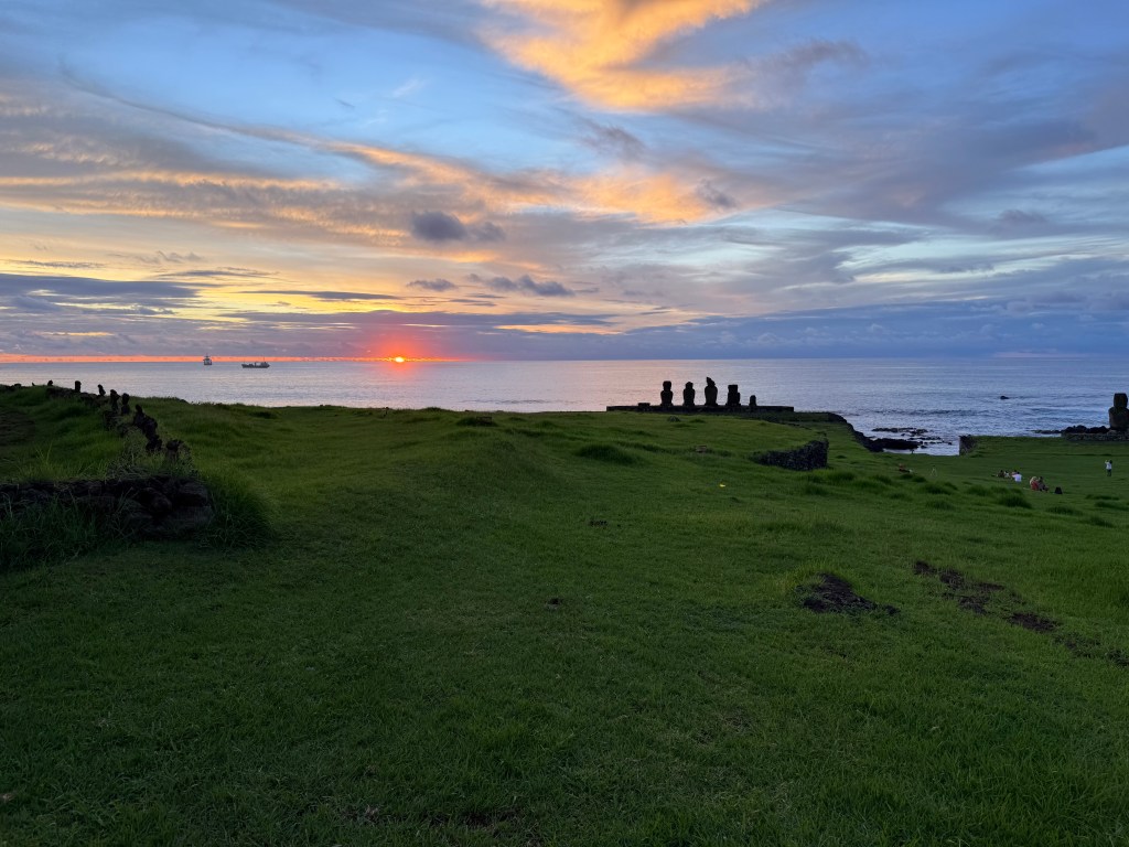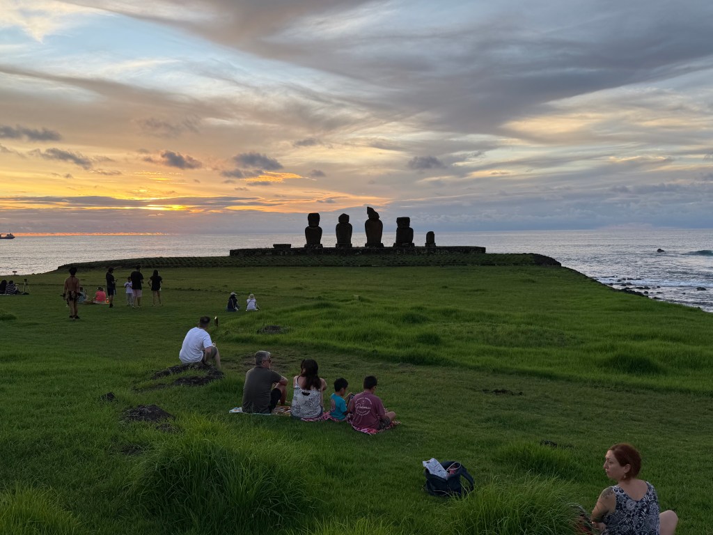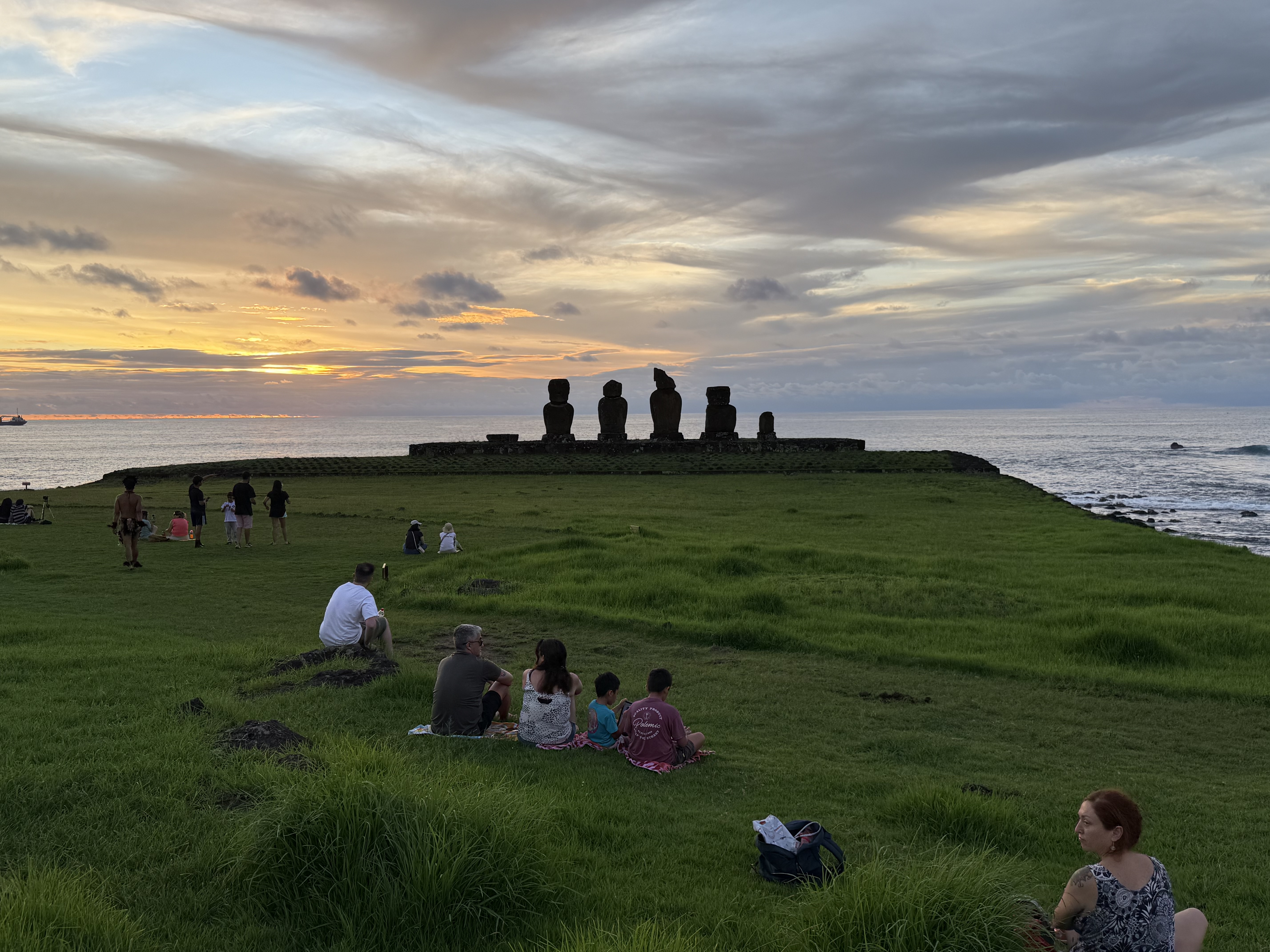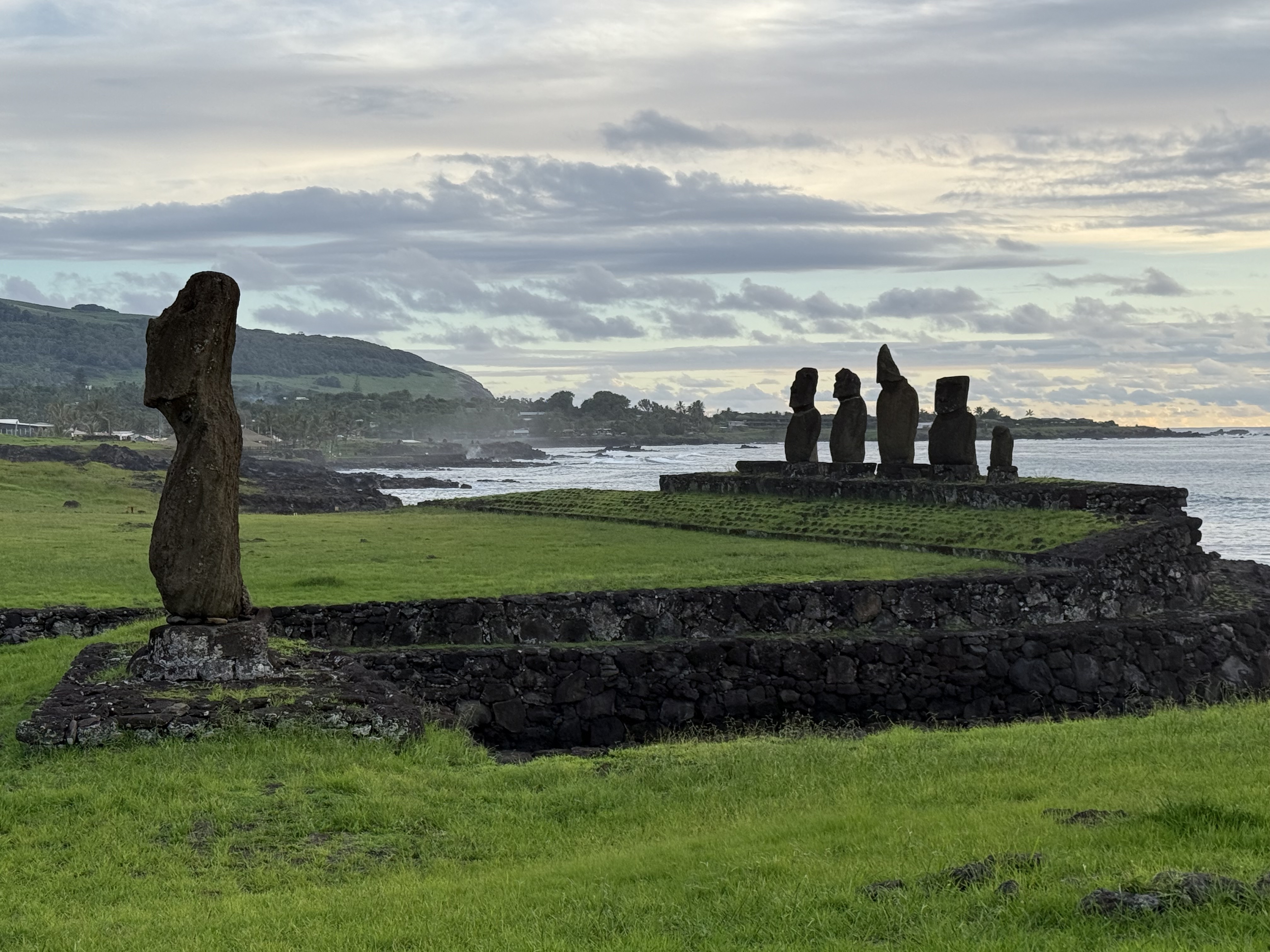 Un peu plus loin, sur le beau site de l’ahu Tahai, cinq statues sont alignées sur leur ahu, dos à la mer, bien sûr, comme tous ceux de l’île (certains guides parlent de moaïs tournés vers l’océan, mais c’est contesté). Celles-ci ont été redressées et remises dans leur position d’origine en 1960 par l’archéologue William Mulloy. C’est un site inoubliable qui attire les touristes et les autochtones à la tombée de la nuit où on assiste assis sur l’herbe verte à un magnifique coucher de soleil sur la mer avec les moaïs au premier plan.
