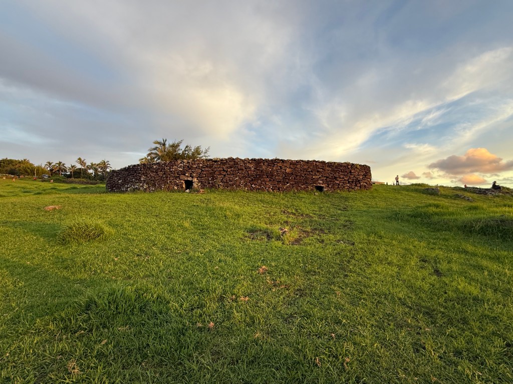 Sur ce site, on découvre également les vestiges d’anciennes cabanes en forme de coque de bateau renversé. Pierre Loti, venu en 1872 en a réalisé des représentations précises. Il y a même pénétré à l’intérieur, reçu par un chef et le raconte dans ses intéressantes mémoires illustrées de plusieurs dessins.L’ahu Akapu, tout près, un moaï isolé portant une coiffe, considéré parmi les plus anciens, est particulièrement beau. Tous les moaïs sont sculptés sur le même modèle, mais, nés de la main de l’homme, leurs expressions sont différentes. Quand on les regarde longuement, on peut prêter à chacun une émotion particulière : il y en a des graves, des attentifs, des souriants, des sages, des énervés, etc. Un jeu à faire sur les ahus où sont lisibles leurs traits, ce qui n’est pas toujours le cas, il y en a beaucoup de très dégradés par le temps dont il ne reste qu’une vague forme, voire quelques pierres juchées sur des ahus, eux mêmes effondrés. Sur cet immense champ vert face au bleu du Pacifique, on a pu voir un groupe d’une quinzaine de magnifiques chevaux aux couleurs fauves tachetées de blanc accompagnés de leurs adorables et sveltes poulains, se balader librement. Une vision des origines.