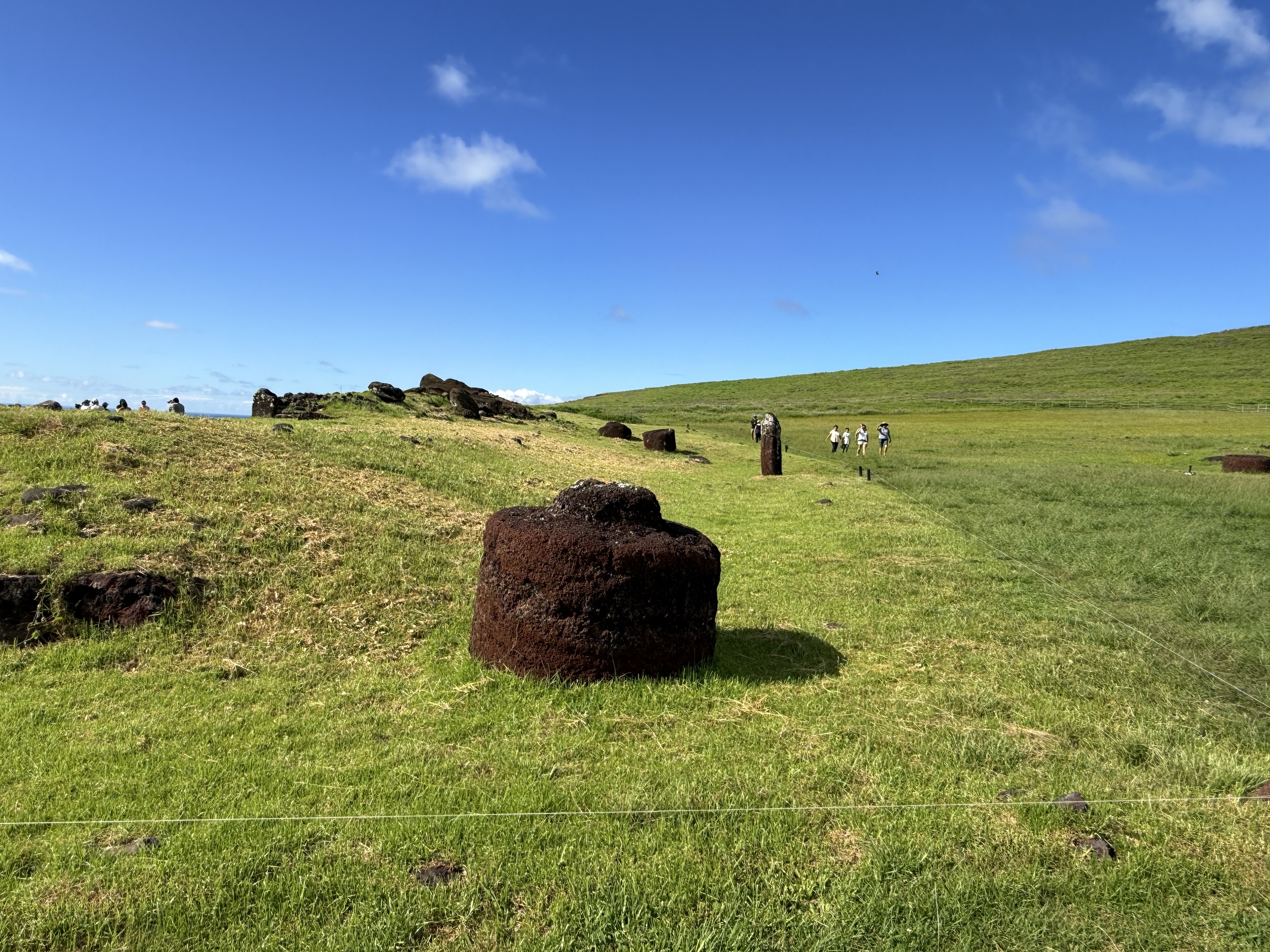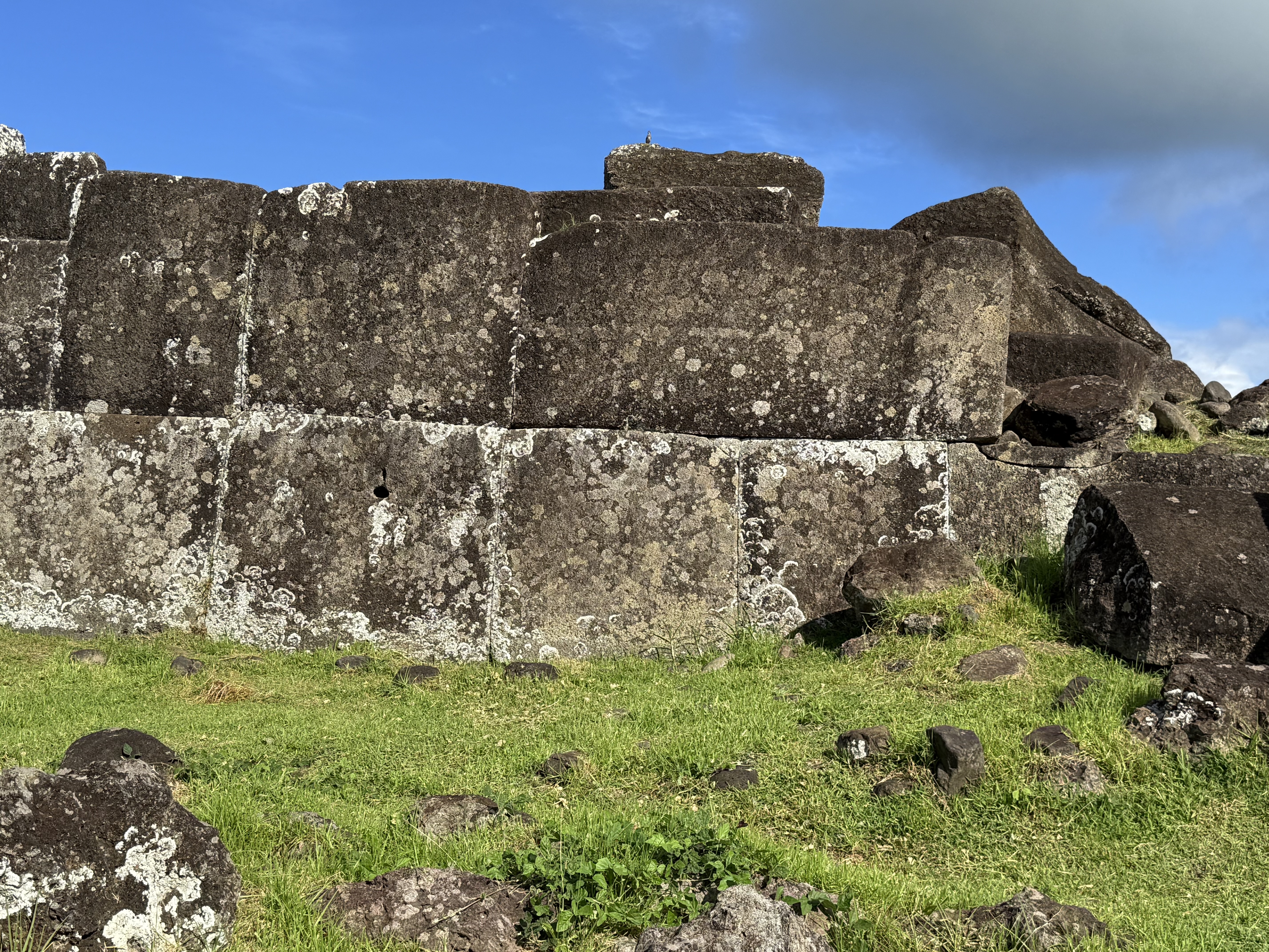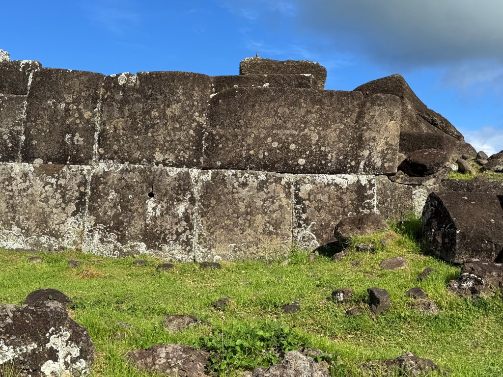 Le site de l’ahu Vinapu auquel nous a conduit Delphine, recèle un autre des grands mystères de l’île : un mur gigantesque de blocs de plusieurs tonnes en pierres taillées parfaitement appareillées et finement ajustées. Il présente les mêmes caractéristiques que ceux des murs Incas que nous avions vu à Cuzco et au Macchu Picchu. Cela ne peut être un hasard, on est forcé de penser que des Incas sont venus à cet endroit précis, ont vécu là un moment, puis soient retournés dans leur pays puisqu’il n’existe ici aucune autre mur de ce type. Ce mur est problématique car il contredit les théories concernant l’origine strictement polynésienne des Rapa Nui. Les Incas arrivés du Pérou, de l’autre côté de l’Océan ont été présents sur l’ile pendant quelques années. Ce lieu a dû être considéré comme sacré. On y voit une grande tête de moaï et des plus petites, de même que plusieurs pukaos (chapeaux rouges) posés sur le sol. Eux aussi ont beaucoup voyagé dans l’île.
