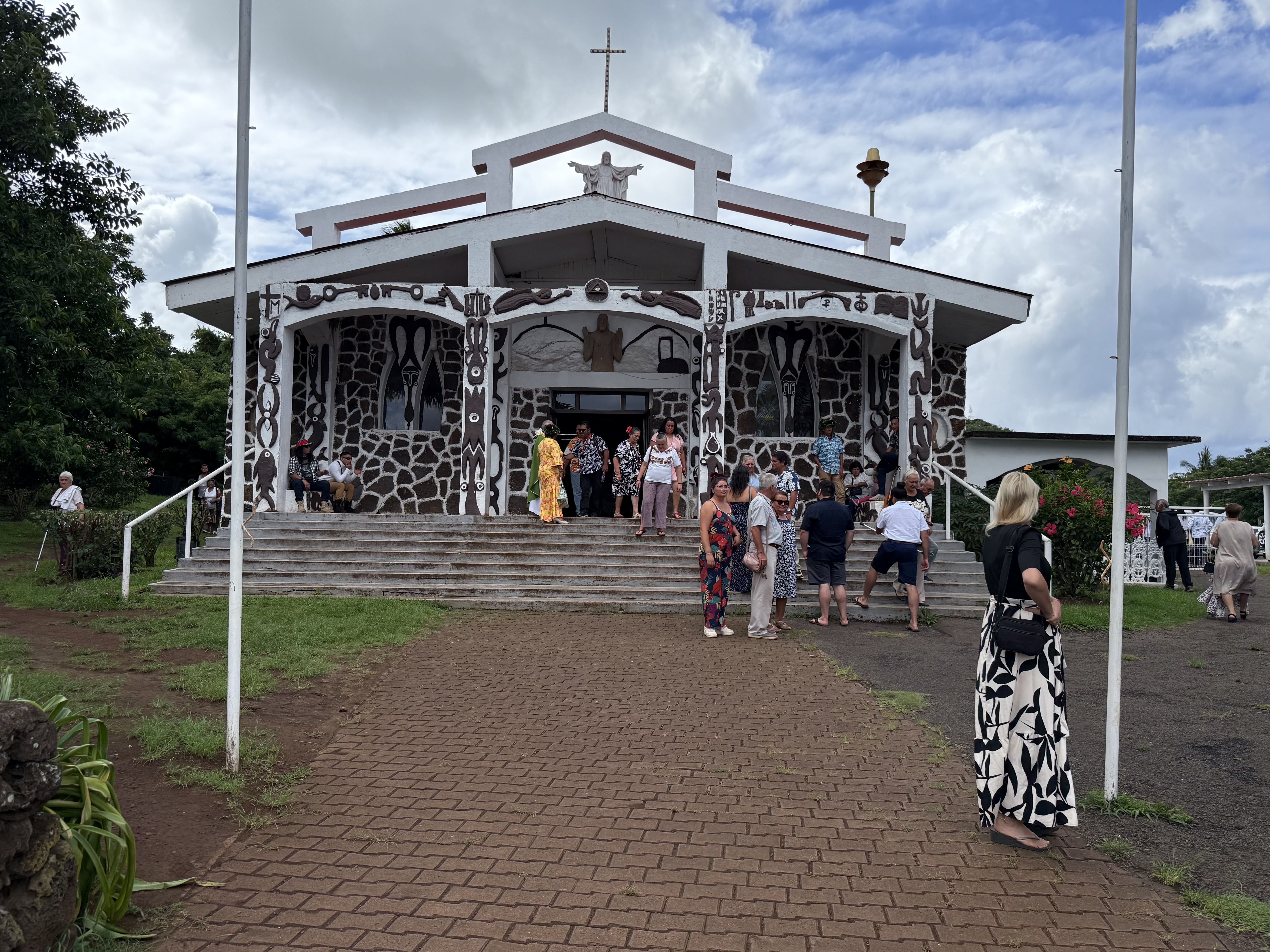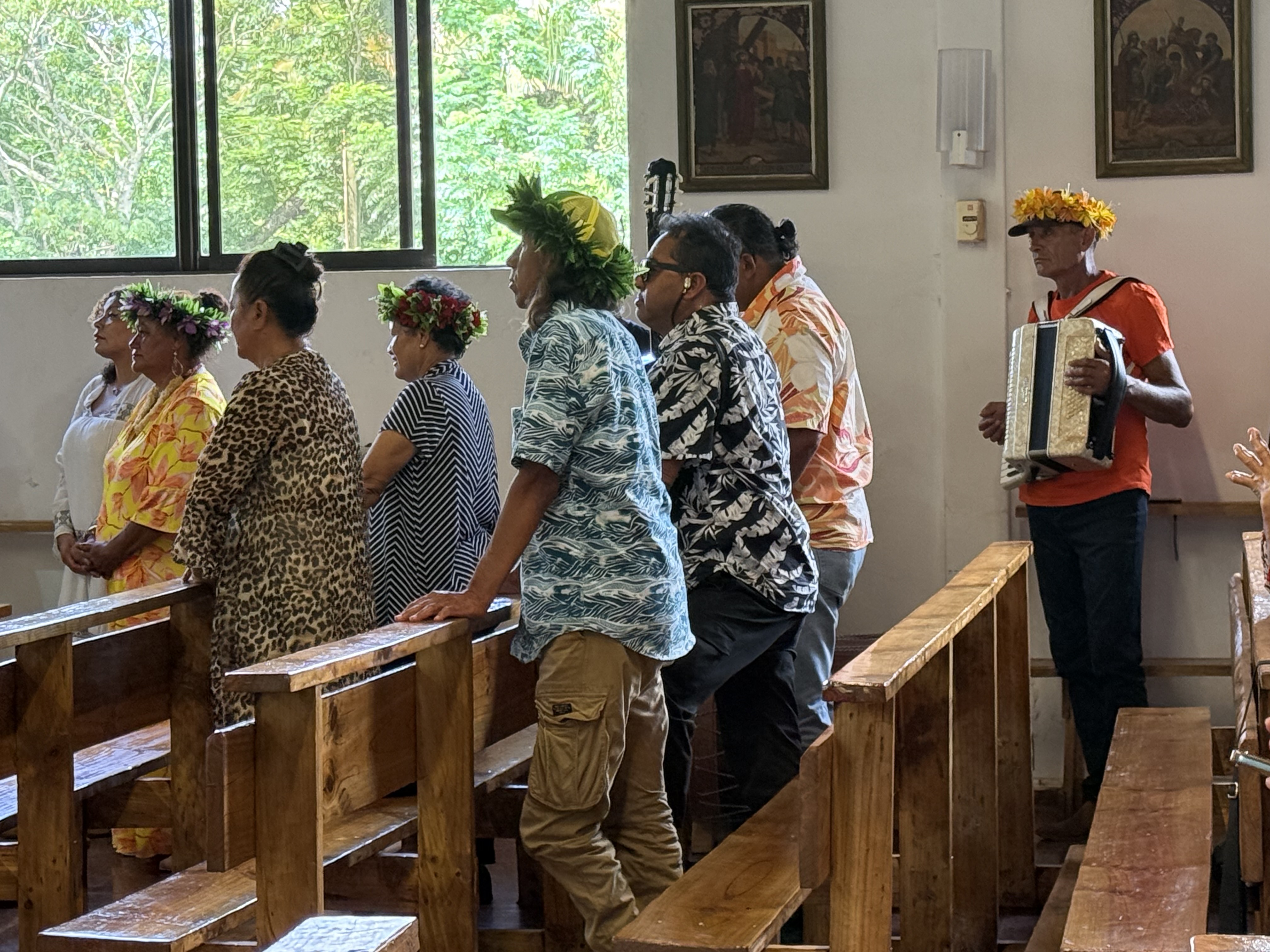 Dimanche, Delphine nous avait conseillé de nous rendre à l’église pour la messe de 11h car on y chante des chants traditionnels Rapa Nui accompagnés d’instruments (tambour, guitare, accordéon). Le groupe de chanteuses-chanteurs portaient des sortes de coiffes de fleurs (il me semble que tous les musiciens portent ce genre de coiffes, parfois à plumes, ceux du groupe d’hier soir les avaient mises avant leur show).