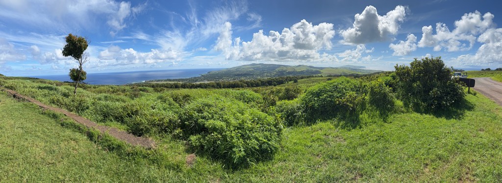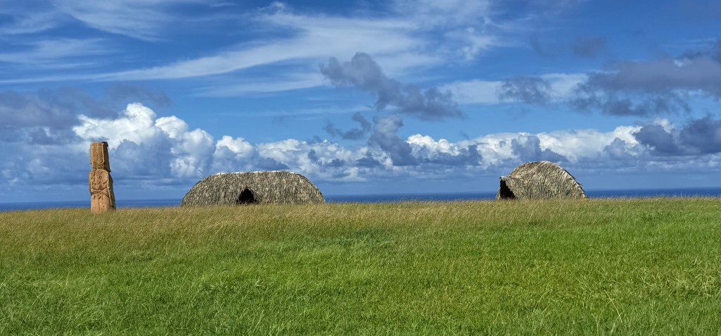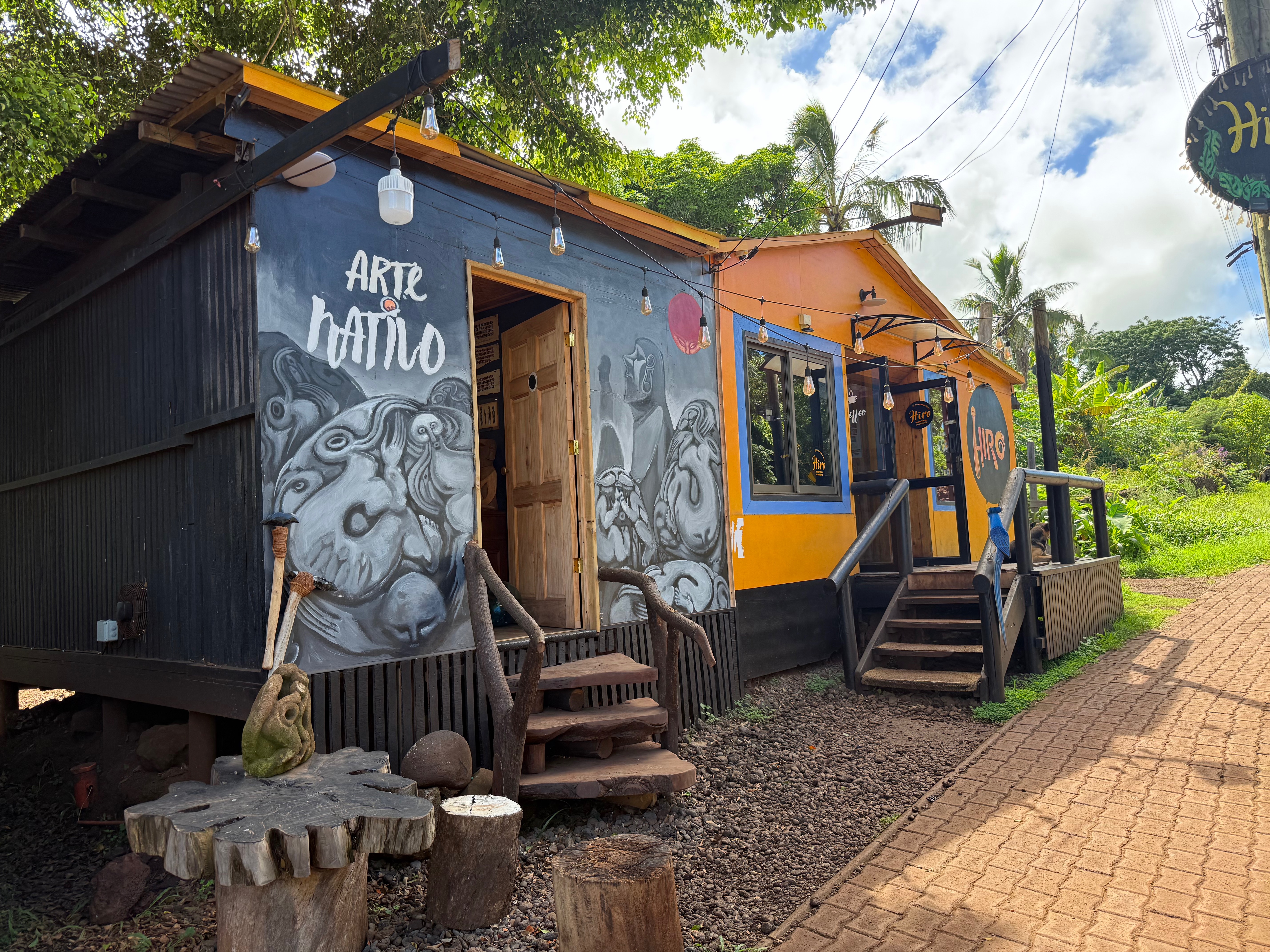 On part visiter trois sites importants, mais avant, nous avions convenu avec Delphine de l’interviewer chez elle. Des questions courtes : « depuis quand vit-elle ici ? En quoi son art est-il influencé par la culture Rapa Nui, ses rencontres, etc.