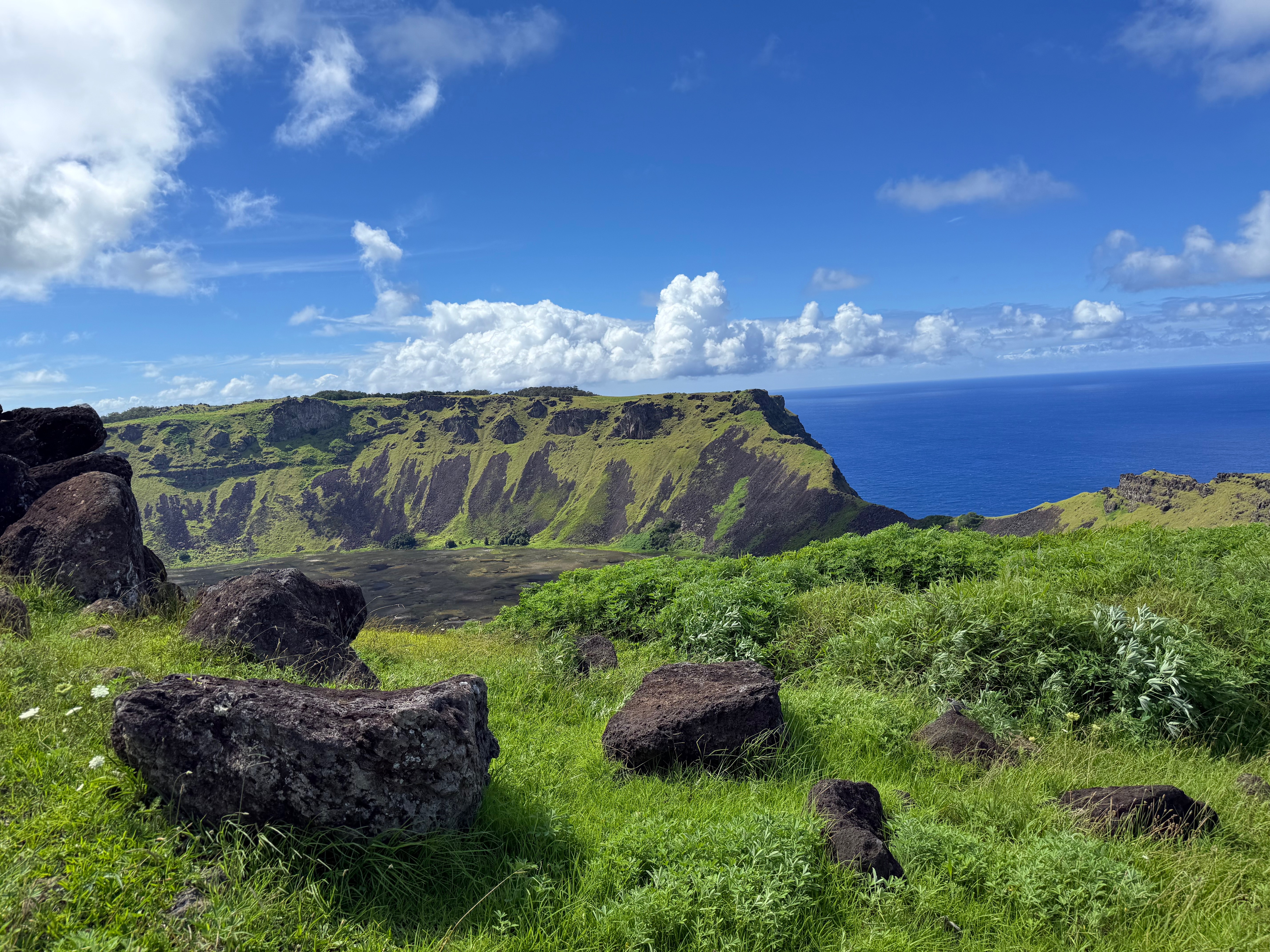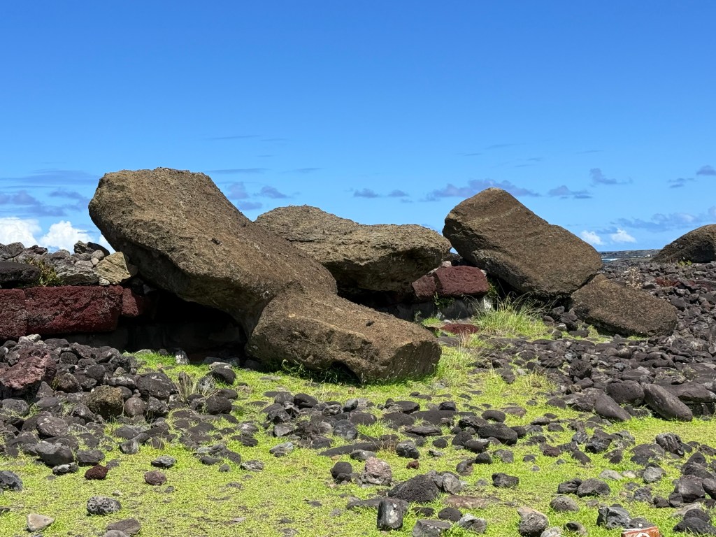 Nous repartons ensuite pour visiter le site le plus émouvant qu’on ait vu : l’ahu Te Peu. Un lieu sublime près de l’océan où deux ahus sont effondrés et les moaïs sont renversés face contre terre. La sérénité qui enveloppait les autres sites fait ici place à un sentiment de tristesse, de regret. On savait que les moaïs avaient été tous renversés à la suite d’événements non encore éclaircis (probablement un changement de culte), qu’ils avaient été couchés délicatement, mais dans ce site, on croit sentir qu’une certaine violence a eu lieu. Un moaï particulièrement suscite ces sentiments : couché obliquement, nez par terre. On voit sa base bien lisse et son corps gisant au milieu des pierres noires et de l’herbe vert tendre qui couvre les sols. A côté de lui, plusieurs autres moaïs sont couchés dans la même position. Un paysage de désolation sous un beau ciel bleu avec à l’arrière-plan les rochers découpés sur l’esquels viennent s’éclater des vagues d’un blanc immaculé. Van Gogh en aurait fait une toile sublime.