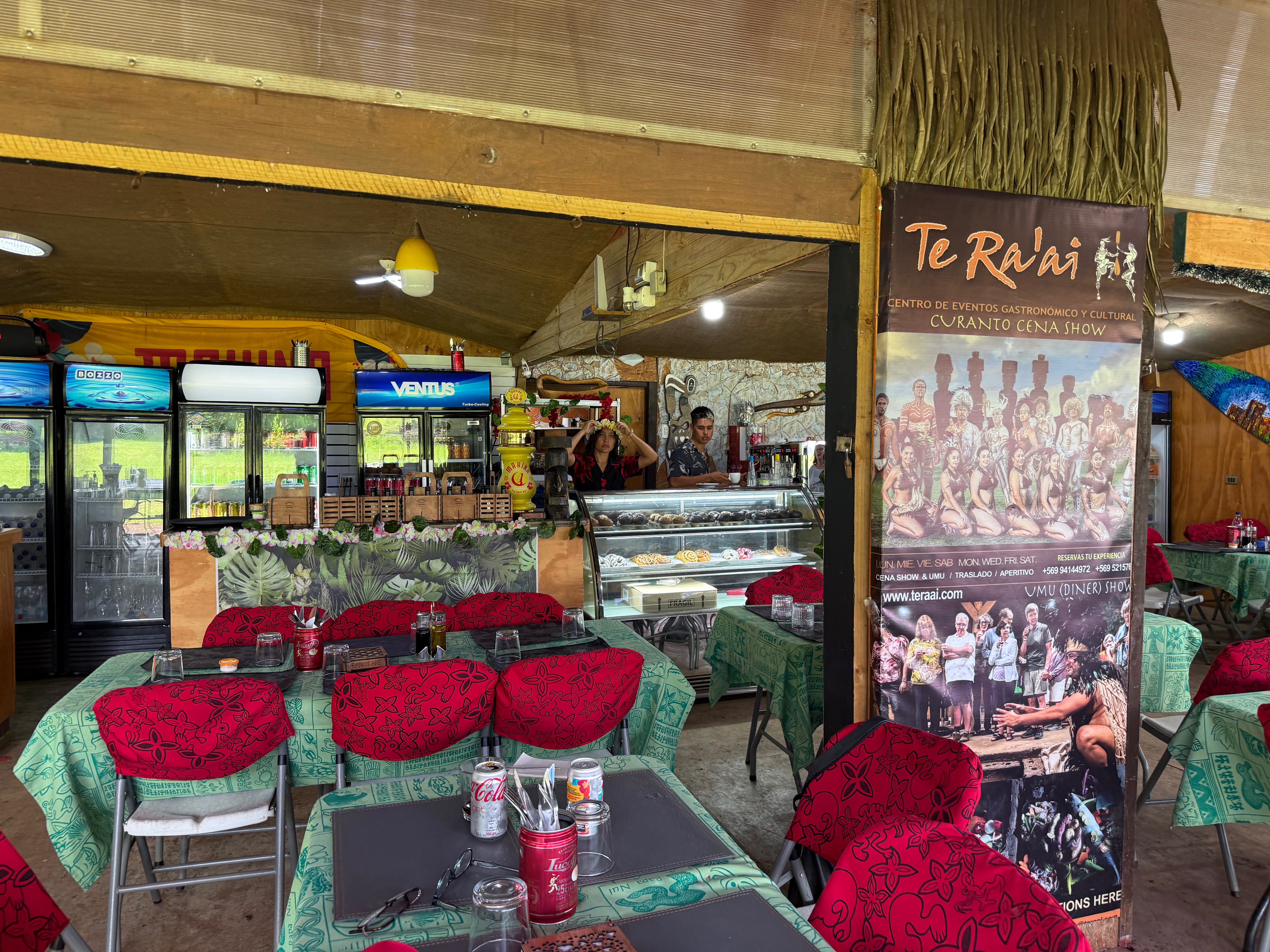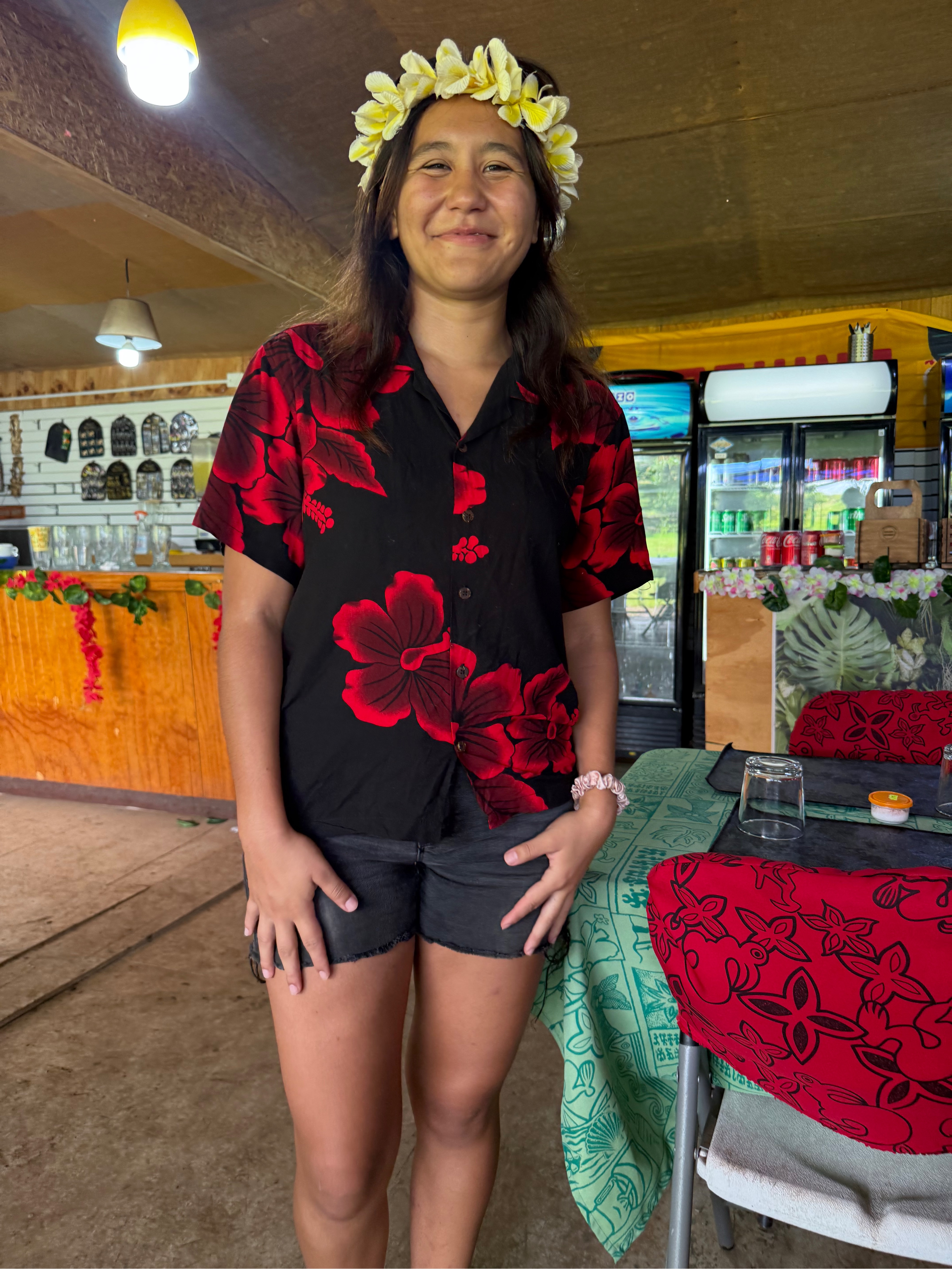 En se garant à l’ombre dans le parking, on découvre un charmant restau très coloré bien abrité au milieu des arbres. Il y a beaucoup de monde et de tables. Il accueille les groupes pour leur pause déjeuner, mais ceux-ci sont en train de partir. Je demande par gestes si on peut déjeuner, « bien sûr, installez-vous où vous voulez ». Une charmante serveuse avec une belle chemise noire à grandes fleurs rouges (je veux la même), une couronne de fleurs sur la tête nous apporte le menu très simple de platos : un de poisson, l’autre de viande, un de poulet, un de salade et un dessert du jour. Un patron baraqué et souriant vient prendre la commande, nous sympathisons, je lui dis que j’aimerais bien acheter quelques mini moaïs en pierre de lave d’ici.