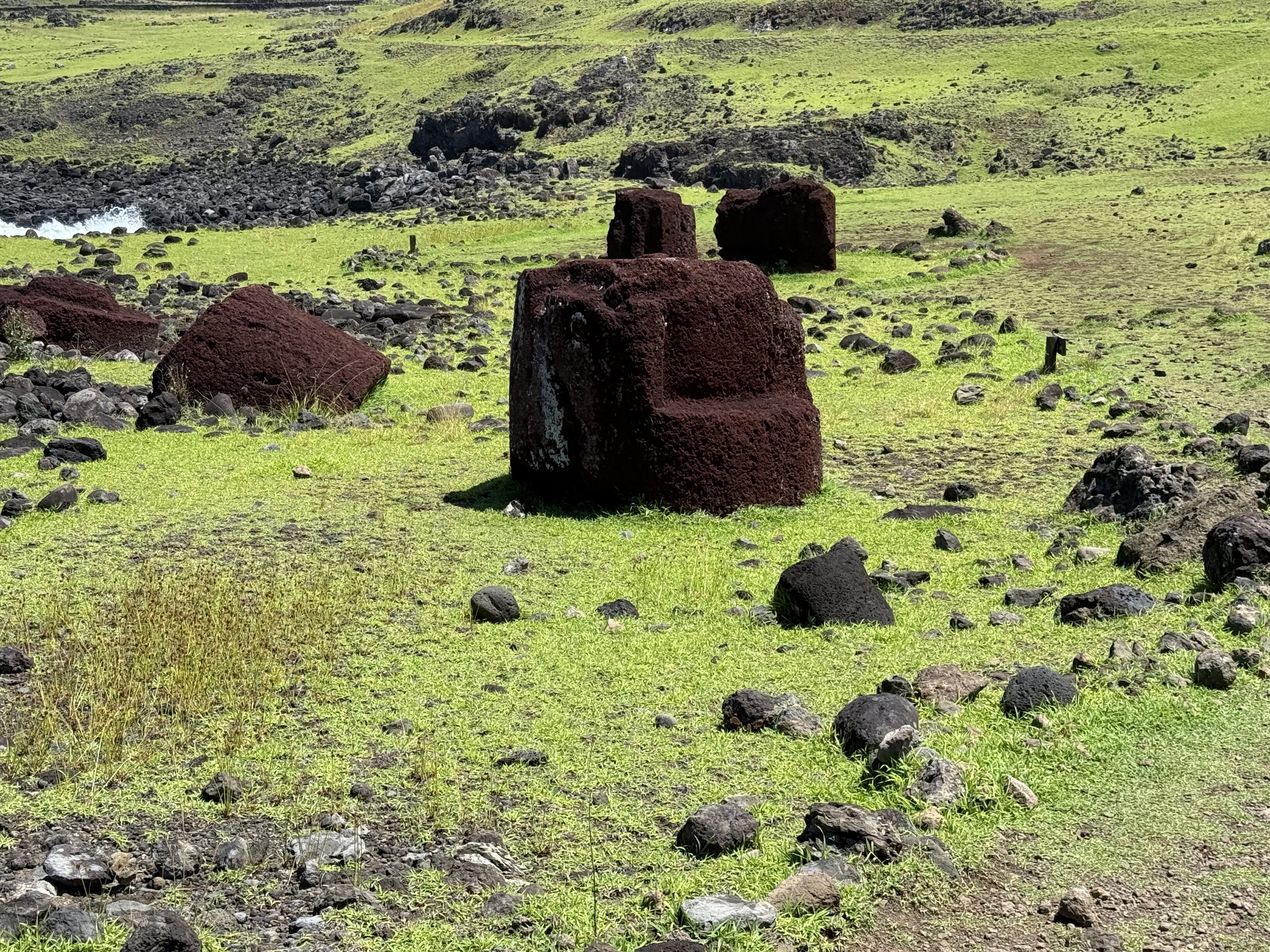 Prochaine étape : Puna Pau, le célèbre volcan dont la terre cuite par l’éruption et le soleil a ce beau rouge indéfinissable dont sont faits les pukaos, les coiffes des moaïs. On en voit certaines à l’intérieur du cratère et beaucoup d’autres autour, balisant elles aussi les chemins que devaient parcourir ces masses rondes qui étaient probablement roulées jusqu’à leur destination finale : la tête des moaïs. D’ailleurs, on a du mal à imaginer comment sur des moaïs déja debouts, les sculpteurs pouvaient leur poser le chapeau sur la tête.