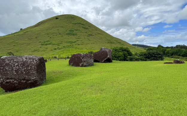 Notre ballade autour de l’île nous ramène au volcan Raraku. Nous ne pouvons y pénétrer (on n’a le droit qu’à une seule entrée), mais de l’extérieur, on a de belles vues d’ensemble de la montagne carrière avec sur ses flancs et à ses pieds, des dizaines de moaïs dans différentes positions.