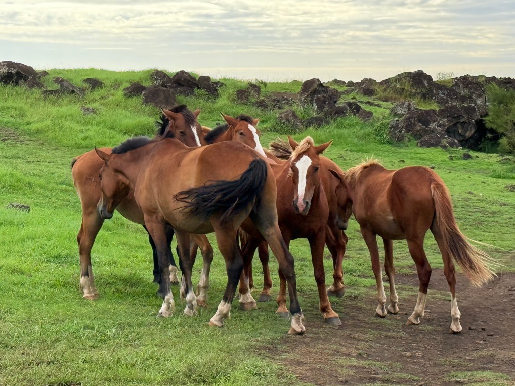 Pour notre dernière visite de site, Delphine a choisi l’Ahu Akivi celui dont les légendes racontent qu’il a été le premier. Le roi Hotu Matu’a aurait envoyé sept explorateurs dont cinq venaient des Marquises (dont on dit que la langue n’est pas très éloignée de celle des Rapa Nui). Ces sept moaïs les personnifient. On dit aussi que ce sont les seuls qui regardent la mer, mais étant au centre de l’île, c’est probablement une interprétation des européens. Tous les moaïs (qui sont des ancêtres) regardent vers les terres pour protéger leur lignée.