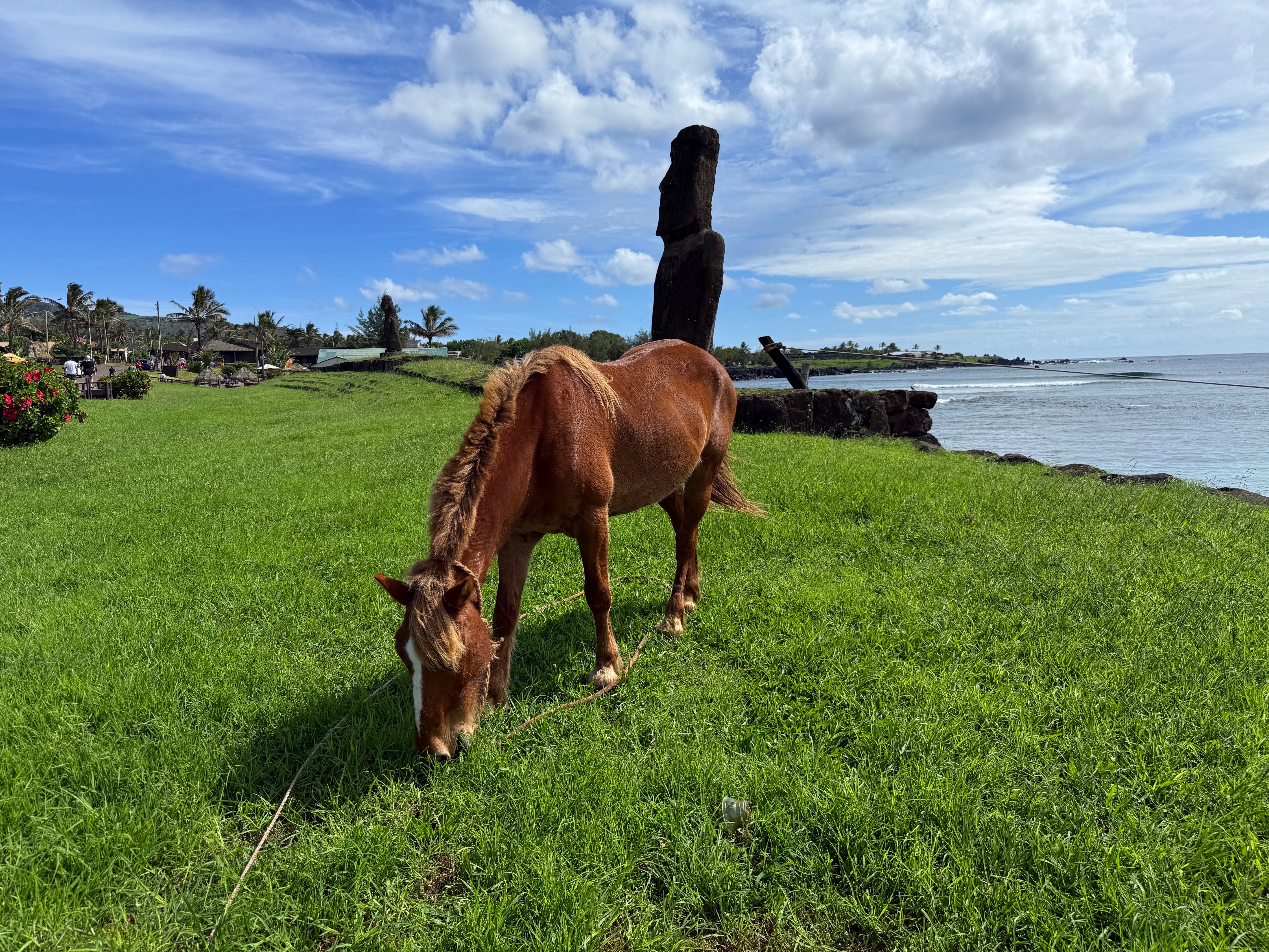 Grâce à un vidéo-projecteur, on pouvait lire sur le mur à droite de l’autel les paroles des chansons dans leur langue. Une jeune fille avec son pc était à la manœuvre. On passe une journée tranquille en se promenant autour de Hanga Roa qu’on commence à bien connaître.