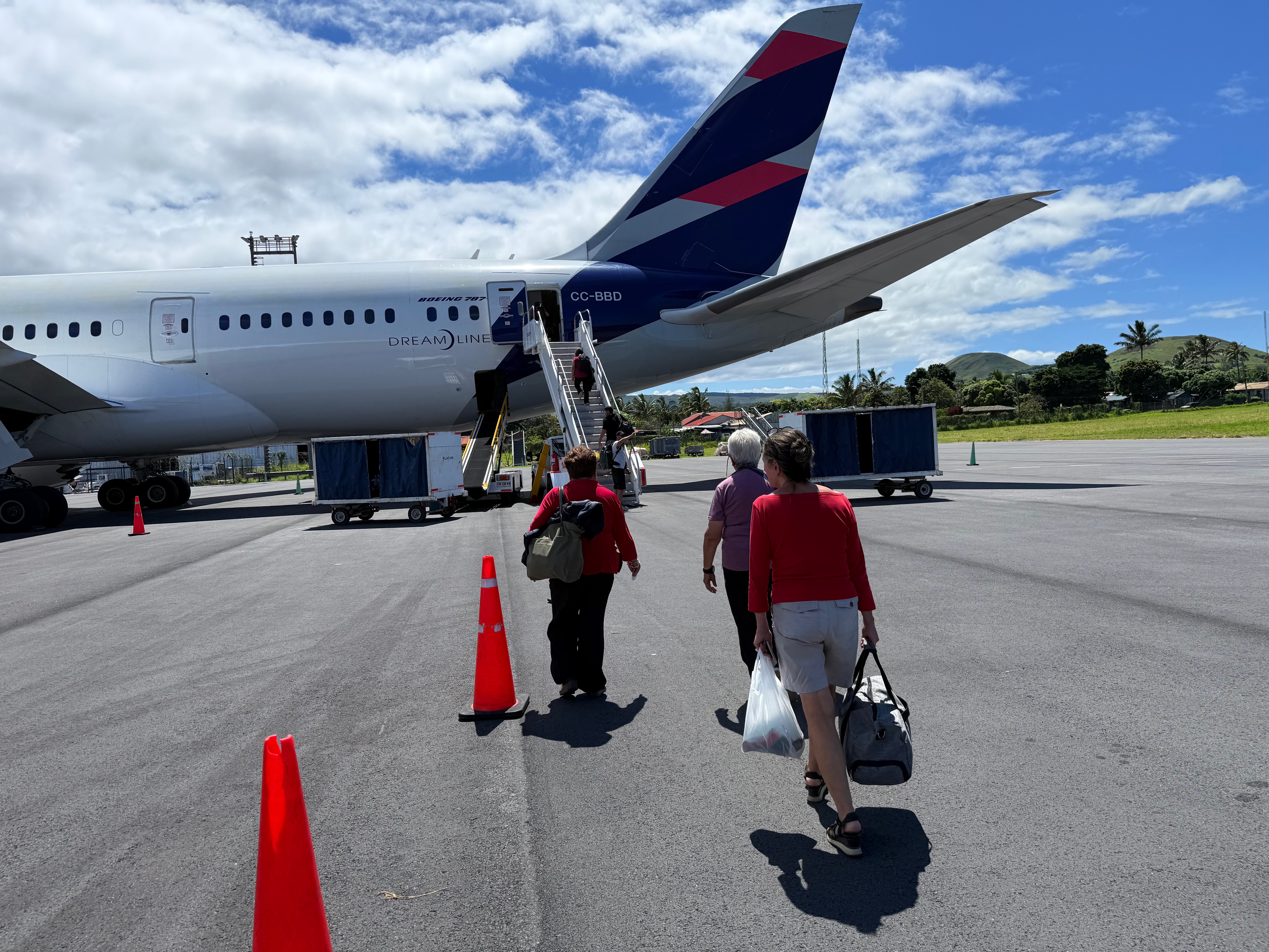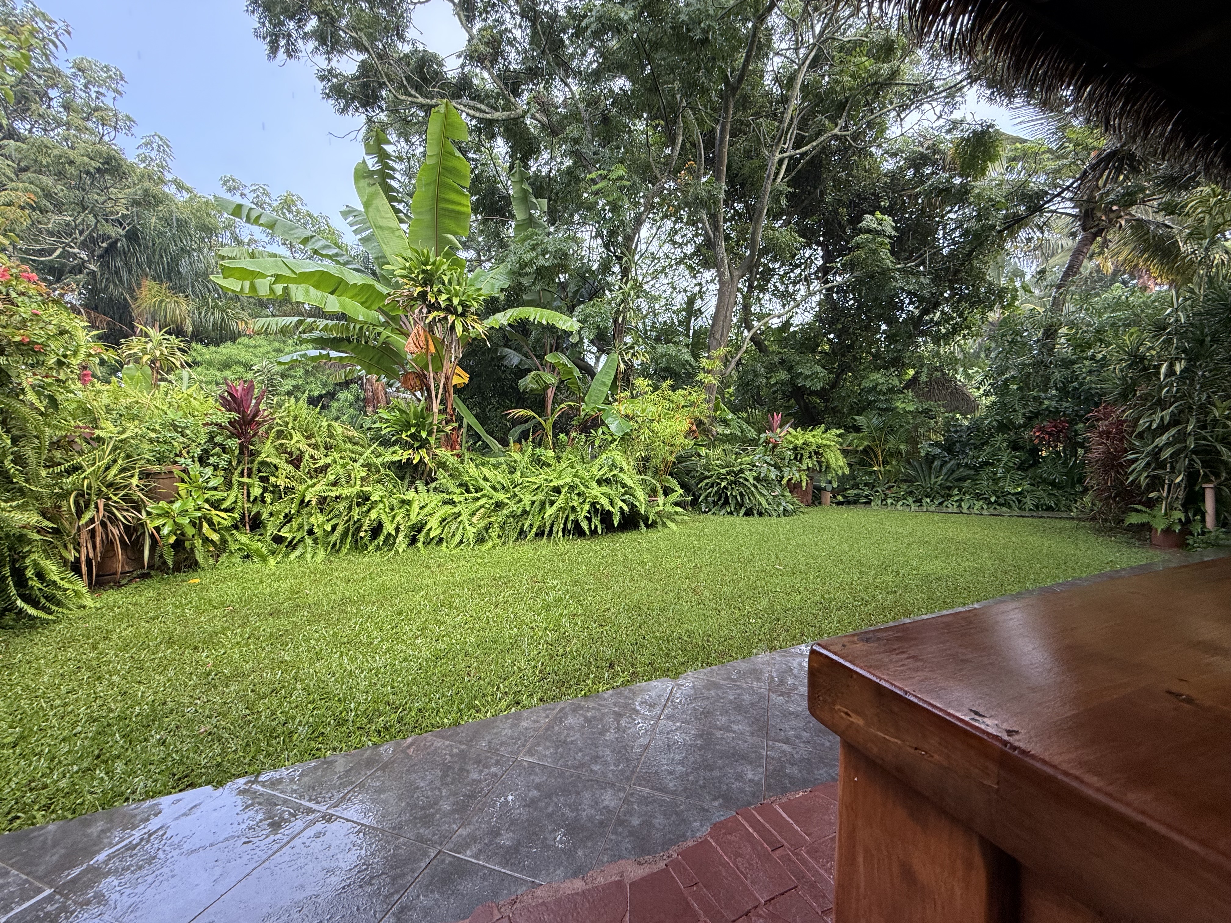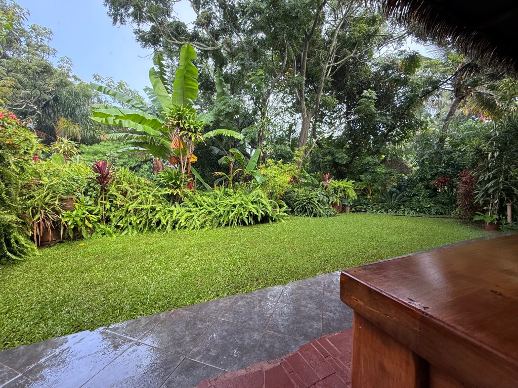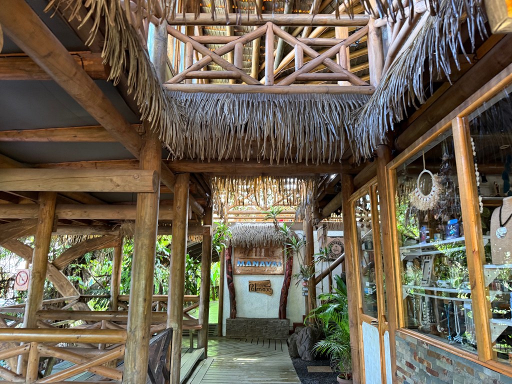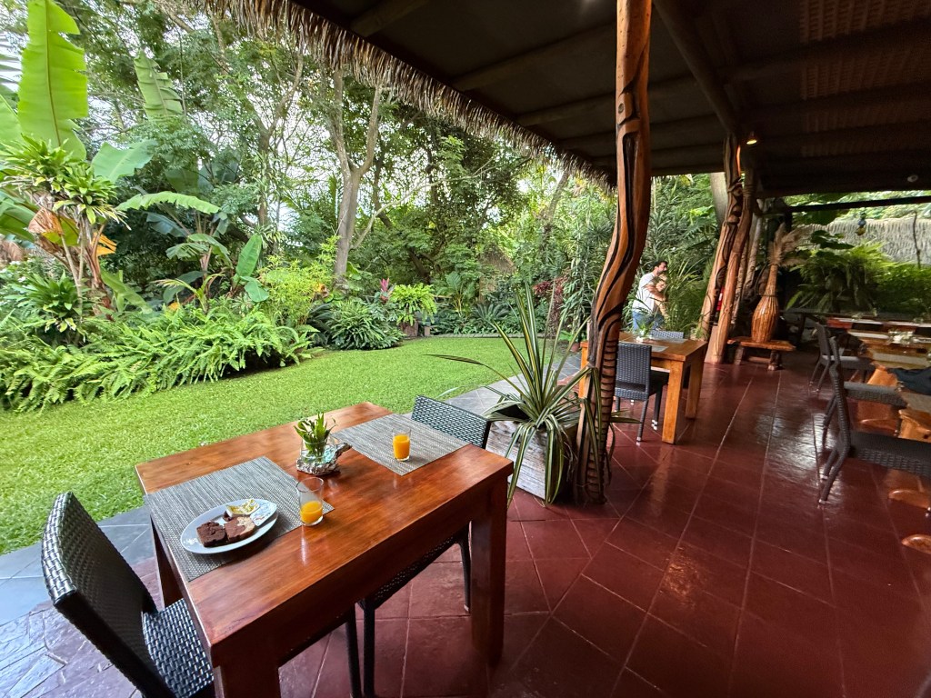 Le lendemain, Delphine nous rejoint dans l’adorable hôtel où nous avons emménagé depuis deux jours. Junglesque, intégré dans la nature avec de jolis meubles en bois brut lissé et vernis, les colonnes toutes sculptées de motifs rapa nui, c’est le plus bel endroit au monde pour petit-déjeuner.