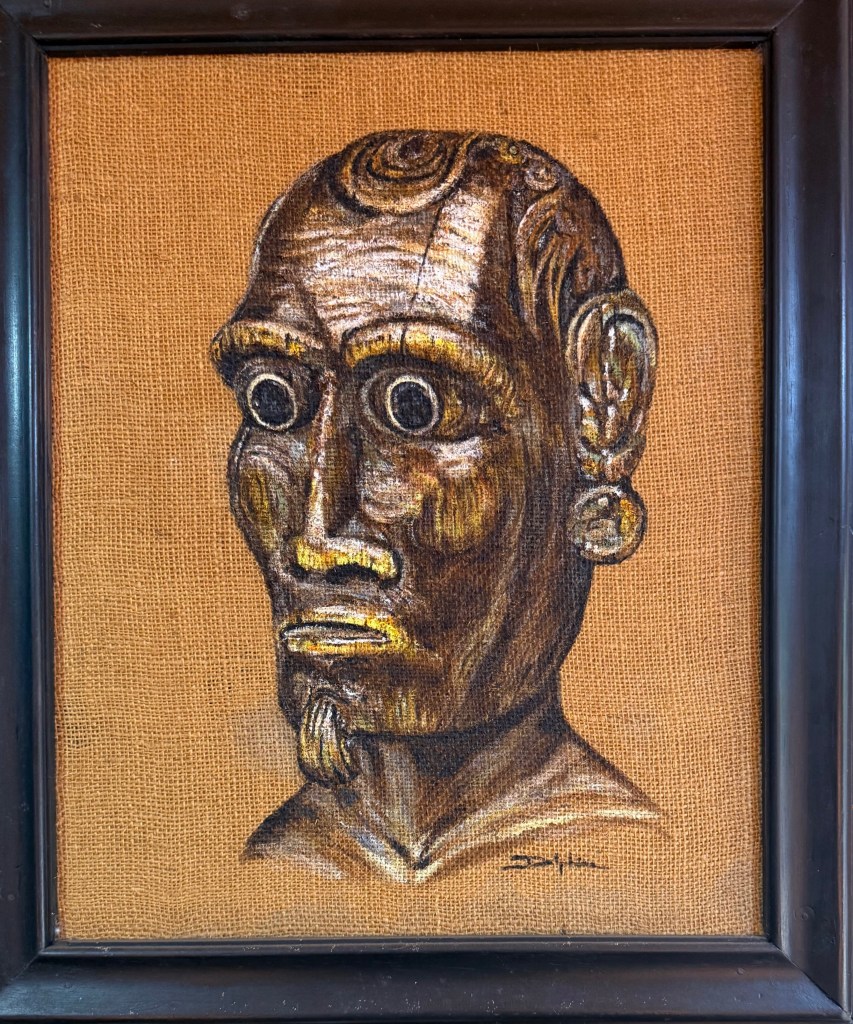 Nous nous rendons ensuite chez un de ses amis Rapa Nui qui est sculpteur, un des meilleurs de l’île. Chaque année, il y a des compétitions, et il a obtenu plusieurs fois le grand prix. Nous admirons son travail et j’en profite pour lui proposer un petit interview, mes questions sont traduites par Delphine (pour les réponses, on fera la traduction à Nice). On achète un de ses beaux petits moaïs en bois. Au mur, une peinture de Delphine.