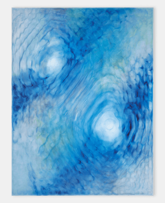 Ainsi l’exposition s’ouvre sur l’œuvre immersive de Flora Moscovici où, après avoir descendu un escalier poétique au ciel duquel une corde bleue se dissémime en branchages et neurones, nous sommes plongés littéralement dans un bain de couleurs fluides du plafond au sol. Elle se poursuit dans les salles souterraines par les grands tableaux de Bowling et Morgenthaler dont les couleurs diluées semblent se régénérer d’elles-mêmes.