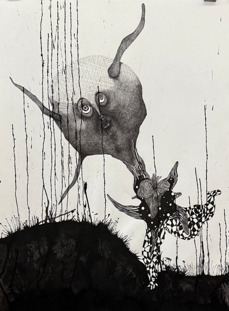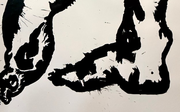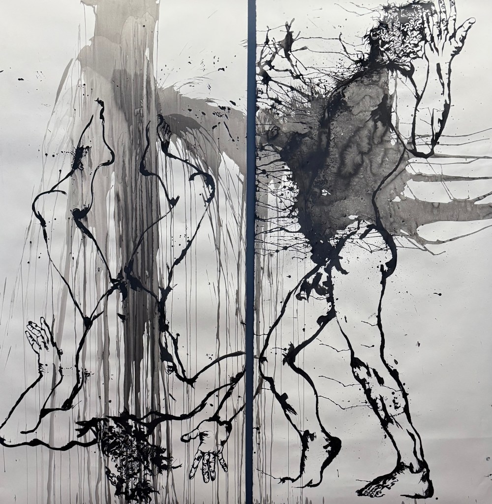 Entre contrôle du geste, recherche précise de la forme et de son contraire, le jet d’encre ou la tache, le peintre cherche l’expression la plus proche de ce qu’il veut exprimer, de ce qu’il ressent ou qu’il désire faire ressentir.